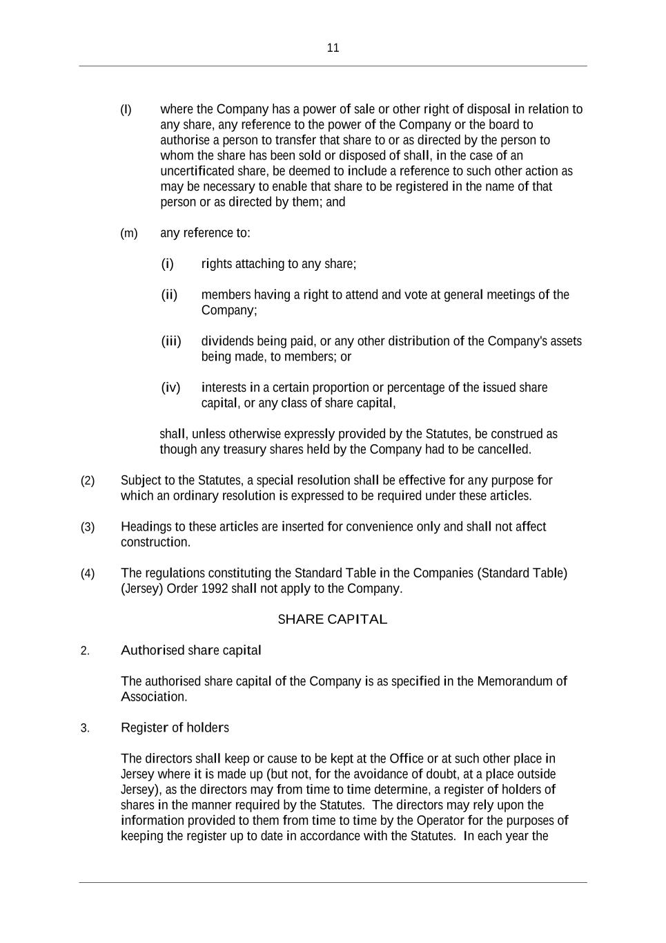 11 (l) where the Company has a power of sale or other right of disposal in relation to any share, any reference to the power of the Company or the board to authorise a person to transfer that share to or as directed by the person to whom the share has been sold or disposed of shall, in the case of an uncertificated share, be deemed to include a reference to such other action as may be necessary to enable that share to be registered in the name of that person or as directed by them; and (m) any reference to: (i) rights attaching to any share; (ii) members having a right to attend and vote at general meetings of the Company; (iii) dividends being paid, or any other distribution of the Company's assets being made, to members; or (iv) interests in a certain proportion or percentage of the issued share capital, or any class of share capital, shall, unless otherwise expressly provided by the Statutes, be construed as though any treasury shares held by the Company had to be cancelled. (2) Subject to the Statutes, a special resolution shall be effective for any purpose for which an ordinary resolution is expressed to be required under these articles. (3) Headings to these articles are inserted for convenience only and shall not affect construction. (4) The regulations constituting the Standard Table in the Companies (Standard Table) (Jersey) Order 1992 shall not apply to the Company. SHARE CAPITAL 2. Authorised share capital The authorised share capital of the Company is as specified in the Memorandum of Association. 3. Register of holders The directors shall keep or cause to be kept at the Office or at such other place in Jersey where it is made up (but not, for the avoidance of doubt, at a place outside Jersey), as the directors may from time to time determine, a register of holders of shares in the manner required by the Statutes. The directors may rely upon the information provided to them from time to time by the Operator for the purposes of keeping the register up to date in accordance with the Statutes. In each year the