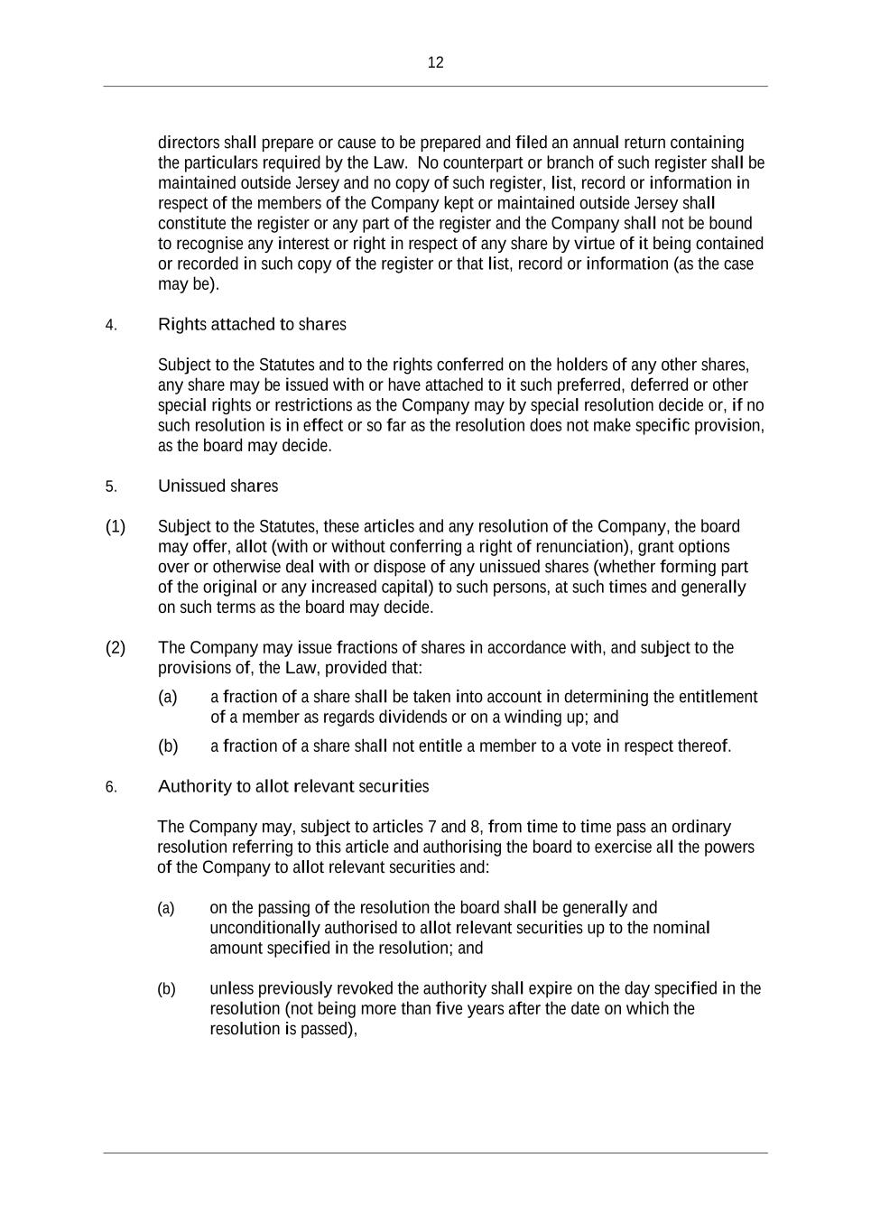 12 directors shall prepare or cause to be prepared and filed an annual return containing the particulars required by the Law. No counterpart or branch of such register shall be maintained outside Jersey and no copy of such register, list, record or information in respect of the members of the Company kept or maintained outside Jersey shall constitute the register or any part of the register and the Company shall not be bound to recognise any interest or right in respect of any share by virtue of it being contained or recorded in such copy of the register or that list, record or information (as the case may be). 4. Rights attached to shares Subject to the Statutes and to the rights conferred on the holders of any other shares, any share may be issued with or have attached to it such preferred, deferred or other special rights or restrictions as the Company may by special resolution decide or, if no such resolution is in effect or so far as the resolution does not make specific provision, as the board may decide. 5. Unissued shares (1) Subject to the Statutes, these articles and any resolution of the Company, the board may offer, allot (with or without conferring a right of renunciation), grant options over or otherwise deal with or dispose of any unissued shares (whether forming part of the original or any increased capital) to such persons, at such times and generally on such terms as the board may decide. (2) The Company may issue fractions of shares in accordance with, and subject to the provisions of, the Law, provided that: (a) a fraction of a share shall be taken into account in determining the entitlement of a member as regards dividends or on a winding up; and (b) a fraction of a share shall not entitle a member to a vote in respect thereof. 6. Authority to allot relevant securities The Company may, subject to articles 7 and 8, from time to time pass an ordinary resolution referring to this article and authorising the board to exercise all the powers of the Company to allot relevant securities and: (a) on the passing of the resolution the board shall be generally and unconditionally authorised to allot relevant securities up to the nominal amount specified in the resolution; and (b) unless previously revoked the authority shall expire on the day specified in the resolution (not being more than five years after the date on which the resolution is passed),