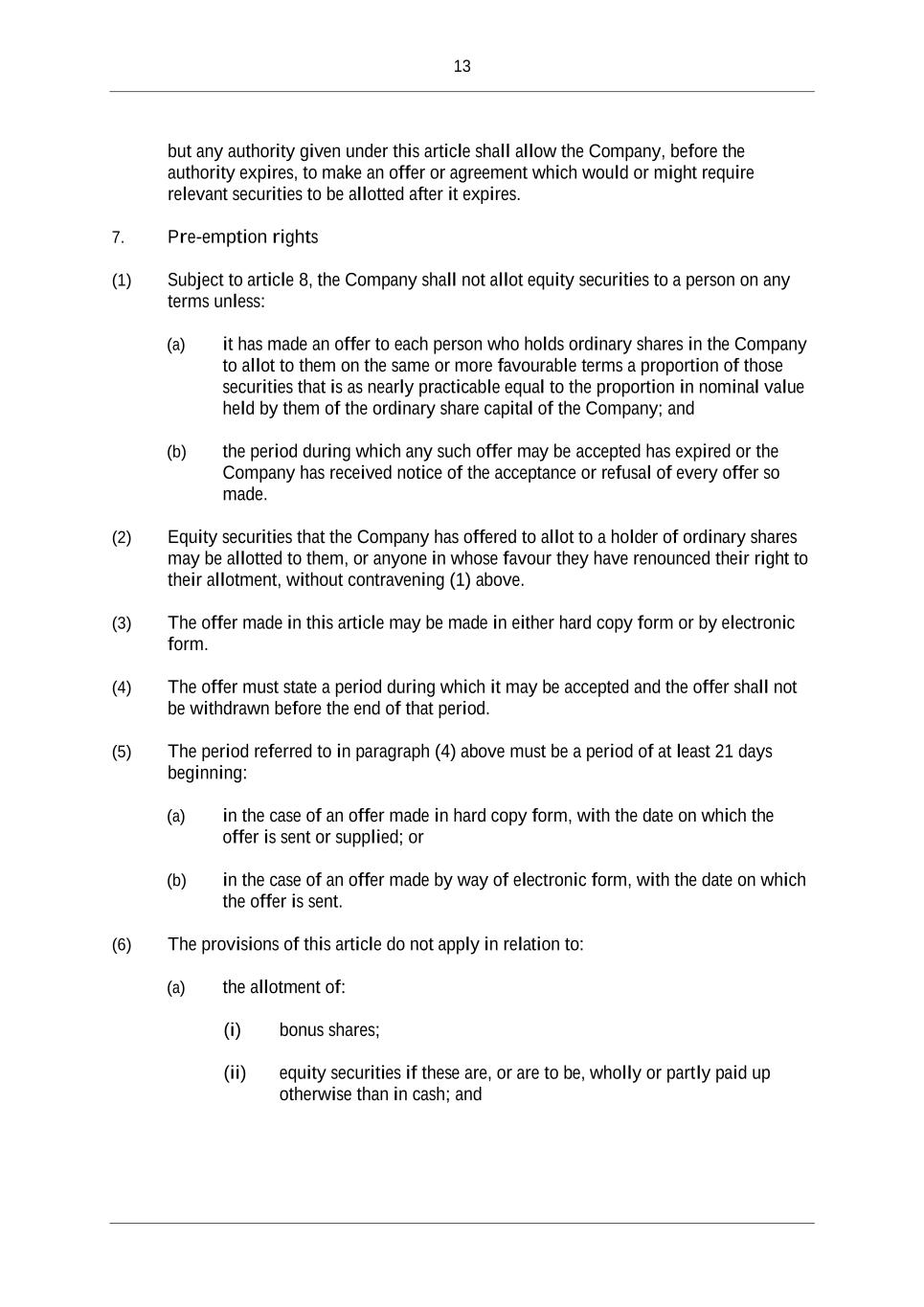 13 but any authority given under this article shall allow the Company, before the authority expires, to make an offer or agreement which would or might require relevant securities to be allotted after it expires. 7. Pre-emption rights (1) Subject to article 8, the Company shall not allot equity securities to a person on any terms unless: (a) it has made an offer to each person who holds ordinary shares in the Company to allot to them on the same or more favourable terms a proportion of those securities that is as nearly practicable equal to the proportion in nominal value held by them of the ordinary share capital of the Company; and (b) the period during which any such offer may be accepted has expired or the Company has received notice of the acceptance or refusal of every offer so made. (2) Equity securities that the Company has offered to allot to a holder of ordinary shares may be allotted to them, or anyone in whose favour they have renounced their right to their allotment, without contravening (1) above. (3) The offer made in this article may be made in either hard copy form or by electronic form. (4) The offer must state a period during which it may be accepted and the offer shall not be withdrawn before the end of that period. (5) The period referred to in paragraph (4) above must be a period of at least 21 days beginning: (a) in the case of an offer made in hard copy form, with the date on which the offer is sent or supplied; or (b) in the case of an offer made by way of electronic form, with the date on which the offer is sent. (6) The provisions of this article do not apply in relation to: (a) the allotment of: (i) bonus shares; (ii) equity securities if these are, or are to be, wholly or partly paid up otherwise than in cash; and