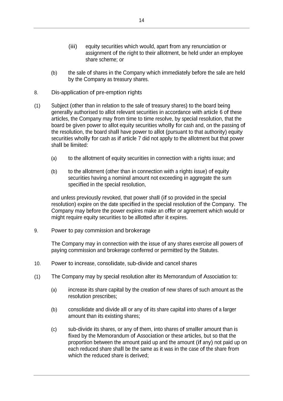 14 (iii) equity securities which would, apart from any renunciation or assignment of the right to their allotment, be held under an employee share scheme; or (b) the sale of shares in the Company which immediately before the sale are held by the Company as treasury shares. 8. Dis-application of pre-emption rights (1) Subject (other than in relation to the sale of treasury shares) to the board being generally authorised to allot relevant securities in accordance with article 6 of these articles, the Company may from time to time resolve, by special resolution, that the board be given power to allot equity securities wholly for cash and, on the passing of the resolution, the board shall have power to allot (pursuant to that authority) equity securities wholly for cash as if article 7 did not apply to the allotment but that power shall be limited: (a) to the allotment of equity securities in connection with a rights issue; and (b) to the allotment (other than in connection with a rights issue) of equity securities having a nominal amount not exceeding in aggregate the sum specified in the special resolution, and unless previously revoked, that power shall (if so provided in the special resolution) expire on the date specified in the special resolution of the Company. The Company may before the power expires make an offer or agreement which would or might require equity securities to be allotted after it expires. 9. Power to pay commission and brokerage The Company may in connection with the issue of any shares exercise all powers of paying commission and brokerage conferred or permitted by the Statutes. 10. Power to increase, consolidate, sub-divide and cancel shares (1) The Company may by special resolution alter its Memorandum of Association to: (a) increase its share capital by the creation of new shares of such amount as the resolution prescribes; (b) consolidate and divide all or any of its share capital into shares of a larger amount than its existing shares; (c) sub-divide its shares, or any of them, into shares of smaller amount than is fixed by the Memorandum of Association or these articles, but so that the proportion between the amount paid up and the amount (if any) not paid up on each reduced share shall be the same as it was in the case of the share from which the reduced share is derived;
