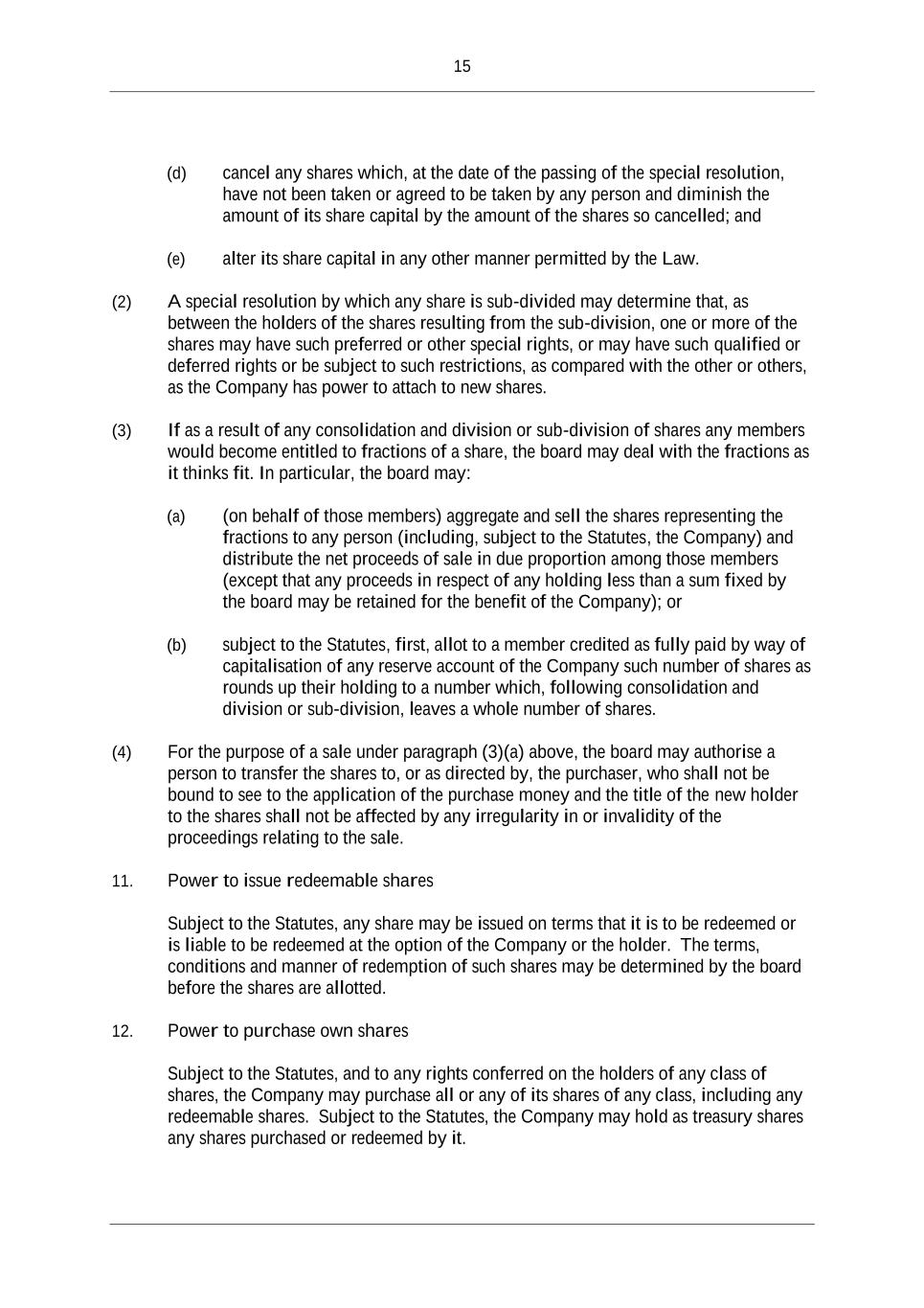 15 (d) cancel any shares which, at the date of the passing of the special resolution, have not been taken or agreed to be taken by any person and diminish the amount of its share capital by the amount of the shares so cancelled; and (e) alter its share capital in any other manner permitted by the Law. (2) A special resolution by which any share is sub-divided may determine that, as between the holders of the shares resulting from the sub-division, one or more of the shares may have such preferred or other special rights, or may have such qualified or deferred rights or be subject to such restrictions, as compared with the other or others, as the Company has power to attach to new shares. (3) If as a result of any consolidation and division or sub-division of shares any members would become entitled to fractions of a share, the board may deal with the fractions as it thinks fit. In particular, the board may: (a) (on behalf of those members) aggregate and sell the shares representing the fractions to any person (including, subject to the Statutes, the Company) and distribute the net proceeds of sale in due proportion among those members (except that any proceeds in respect of any holding less than a sum fixed by the board may be retained for the benefit of the Company); or (b) subject to the Statutes, first, allot to a member credited as fully paid by way of capitalisation of any reserve account of the Company such number of shares as rounds up their holding to a number which, following consolidation and division or sub-division, leaves a whole number of shares. (4) For the purpose of a sale under paragraph (3)(a) above, the board may authorise a person to transfer the shares to, or as directed by, the purchaser, who shall not be bound to see to the application of the purchase money and the title of the new holder to the shares shall not be affected by any irregularity in or invalidity of the proceedings relating to the sale. 11. Power to issue redeemable shares Subject to the Statutes, any share may be issued on terms that it is to be redeemed or is liable to be redeemed at the option of the Company or the holder. The terms, conditions and manner of redemption of such shares may be determined by the board before the shares are allotted. 12. Power to purchase own shares Subject to the Statutes, and to any rights conferred on the holders of any class of shares, the Company may purchase all or any of its shares of any class, including any redeemable shares. Subject to the Statutes, the Company may hold as treasury shares any shares purchased or redeemed by it.
