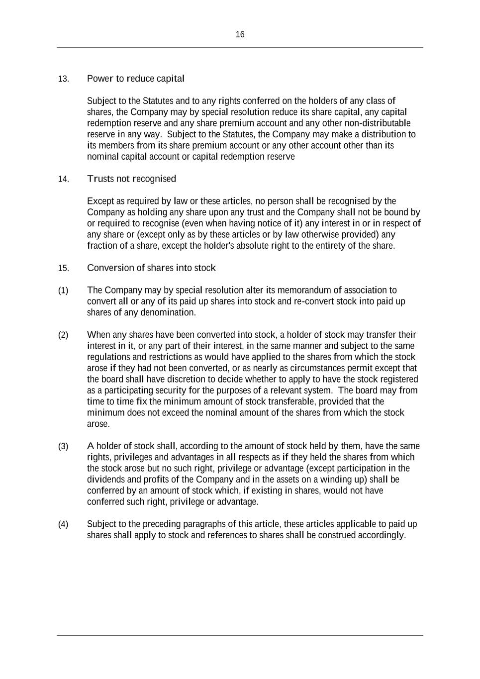 16 13. Power to reduce capital Subject to the Statutes and to any rights conferred on the holders of any class of shares, the Company may by special resolution reduce its share capital, any capital redemption reserve and any share premium account and any other non-distributable reserve in any way. Subject to the Statutes, the Company may make a distribution to its members from its share premium account or any other account other than its nominal capital account or capital redemption reserve 14. Trusts not recognised Except as required by law or these articles, no person shall be recognised by the Company as holding any share upon any trust and the Company shall not be bound by or required to recognise (even when having notice of it) any interest in or in respect of any share or (except only as by these articles or by law otherwise provided) any fraction of a share, except the holder's absolute right to the entirety of the share. 15. Conversion of shares into stock (1) The Company may by special resolution alter its memorandum of association to convert all or any of its paid up shares into stock and re-convert stock into paid up shares of any denomination. (2) When any shares have been converted into stock, a holder of stock may transfer their interest in it, or any part of their interest, in the same manner and subject to the same regulations and restrictions as would have applied to the shares from which the stock arose if they had not been converted, or as nearly as circumstances permit except that the board shall have discretion to decide whether to apply to have the stock registered as a participating security for the purposes of a relevant system. The board may from time to time fix the minimum amount of stock transferable, provided that the minimum does not exceed the nominal amount of the shares from which the stock arose. (3) A holder of stock shall, according to the amount of stock held by them, have the same rights, privileges and advantages in all respects as if they held the shares from which the stock arose but no such right, privilege or advantage (except participation in the dividends and profits of the Company and in the assets on a winding up) shall be conferred by an amount of stock which, if existing in shares, would not have conferred such right, privilege or advantage. (4) Subject to the preceding paragraphs of this article, these articles applicable to paid up shares shall apply to stock and references to shares shall be construed accordingly.