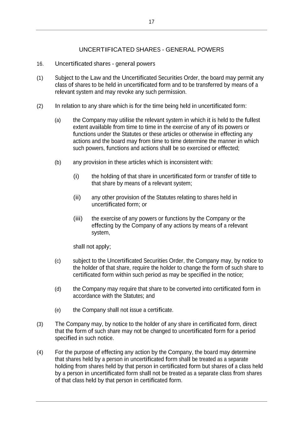 17 UNCERTIFICATED SHARES - GENERAL POWERS 16. Uncertificated shares - general powers (1) Subject to the Law and the Uncertificated Securities Order, the board may permit any class of shares to be held in uncertificated form and to be transferred by means of a relevant system and may revoke any such permission. (2) In relation to any share which is for the time being held in uncertificated form: (a) the Company may utilise the relevant system in which it is held to the fullest extent available from time to time in the exercise of any of its powers or functions under the Statutes or these articles or otherwise in effecting any actions and the board may from time to time determine the manner in which such powers, functions and actions shall be so exercised or effected; (b) any provision in these articles which is inconsistent with: (i) the holding of that share in uncertificated form or transfer of title to that share by means of a relevant system; (ii) any other provision of the Statutes relating to shares held in uncertificated form; or (iii) the exercise of any powers or functions by the Company or the effecting by the Company of any actions by means of a relevant system, shall not apply; (c) subject to the Uncertificated Securities Order, the Company may, by notice to the holder of that share, require the holder to change the form of such share to certificated form within such period as may be specified in the notice; (d) the Company may require that share to be converted into certificated form in accordance with the Statutes; and (e) the Company shall not issue a certificate. (3) The Company may, by notice to the holder of any share in certificated form, direct that the form of such share may not be changed to uncertificated form for a period specified in such notice. (4) For the purpose of effecting any action by the Company, the board may determine that shares held by a person in uncertificated form shall be treated as a separate holding from shares held by that person in certificated form but shares of a class held by a person in uncertificated form shall not be treated as a separate class from shares of that class held by that person in certificated form.