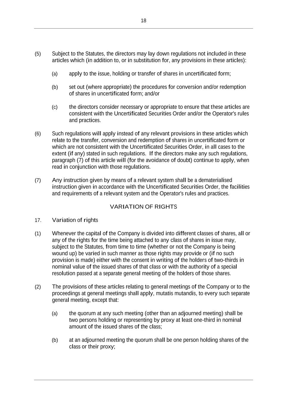 18 (5) Subject to the Statutes, the directors may lay down regulations not included in these articles which (in addition to, or in substitution for, any provisions in these articles): (a) apply to the issue, holding or transfer of shares in uncertificated form; (b) set out (where appropriate) the procedures for conversion and/or redemption of shares in uncertificated form; and/or (c) the directors consider necessary or appropriate to ensure that these articles are consistent with the Uncertificated Securities Order and/or the Operator's rules and practices. (6) Such regulations will apply instead of any relevant provisions in these articles which relate to the transfer, conversion and redemption of shares in uncertificated form or which are not consistent with the Uncertificated Securities Order, in all cases to the extent (if any) stated in such regulations. If the directors make any such regulations, paragraph (7) of this article will (for the avoidance of doubt) continue to apply, when read in conjunction with those regulations. (7) Any instruction given by means of a relevant system shall be a dematerialised instruction given in accordance with the Uncertificated Securities Order, the facilities and requirements of a relevant system and the Operator's rules and practices. VARIATION OF RIGHTS 17. Variation of rights (1) Whenever the capital of the Company is divided into different classes of shares, all or any of the rights for the time being attached to any class of shares in issue may, subject to the Statutes, from time to time (whether or not the Company is being wound up) be varied in such manner as those rights may provide or (if no such provision is made) either with the consent in writing of the holders of two-thirds in nominal value of the issued shares of that class or with the authority of a special resolution passed at a separate general meeting of the holders of those shares. (2) The provisions of these articles relating to general meetings of the Company or to the proceedings at general meetings shall apply, mutatis mutandis, to every such separate general meeting, except that: (a) the quorum at any such meeting (other than an adjourned meeting) shall be two persons holding or representing by proxy at least one-third in nominal amount of the issued shares of the class; (b) at an adjourned meeting the quorum shall be one person holding shares of the class or their proxy;