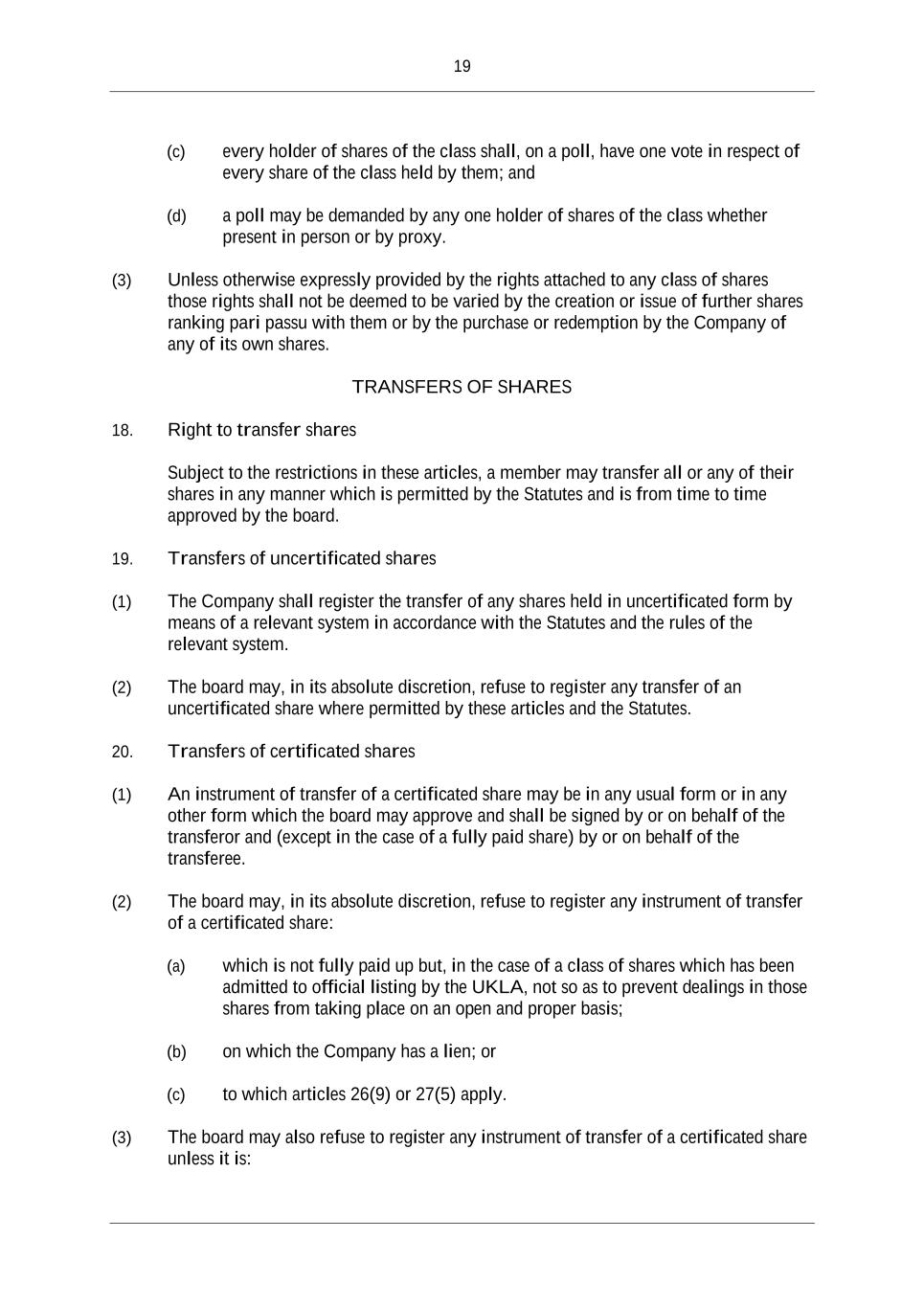 19 (c) every holder of shares of the class shall, on a poll, have one vote in respect of every share of the class held by them; and (d) a poll may be demanded by any one holder of shares of the class whether present in person or by proxy. (3) Unless otherwise expressly provided by the rights attached to any class of shares those rights shall not be deemed to be varied by the creation or issue of further shares ranking pari passu with them or by the purchase or redemption by the Company of any of its own shares. TRANSFERS OF SHARES 18. Right to transfer shares Subject to the restrictions in these articles, a member may transfer all or any of their shares in any manner which is permitted by the Statutes and is from time to time approved by the board. 19. Transfers of uncertificated shares (1) The Company shall register the transfer of any shares held in uncertificated form by means of a relevant system in accordance with the Statutes and the rules of the relevant system. (2) The board may, in its absolute discretion, refuse to register any transfer of an uncertificated share where permitted by these articles and the Statutes. 20. Transfers of certificated shares (1) An instrument of transfer of a certificated share may be in any usual form or in any other form which the board may approve and shall be signed by or on behalf of the transferor and (except in the case of a fully paid share) by or on behalf of the transferee. (2) The board may, in its absolute discretion, refuse to register any instrument of transfer of a certificated share: (a) which is not fully paid up but, in the case of a class of shares which has been admitted to official listing by the UKLA, not so as to prevent dealings in those shares from taking place on an open and proper basis; (b) on which the Company has a lien; or (c) to which articles 26(9) or 27(5) apply. (3) The board may also refuse to register any instrument of transfer of a certificated share unless it is: