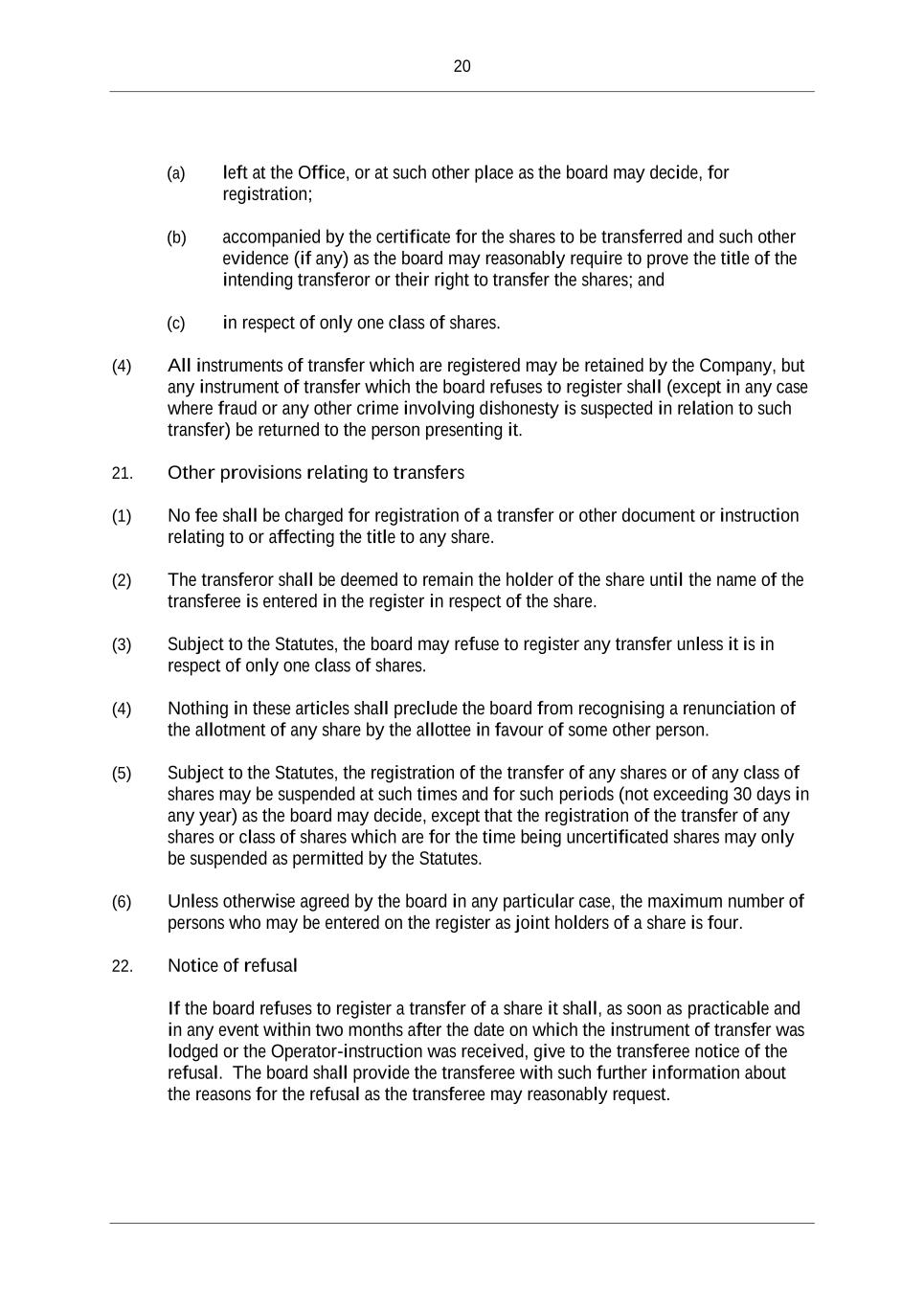 20 (a) left at the Office, or at such other place as the board may decide, for registration; (b) accompanied by the certificate for the shares to be transferred and such other evidence (if any) as the board may reasonably require to prove the title of the intending transferor or their right to transfer the shares; and (c) in respect of only one class of shares. (4) All instruments of transfer which are registered may be retained by the Company, but any instrument of transfer which the board refuses to register shall (except in any case where fraud or any other crime involving dishonesty is suspected in relation to such transfer) be returned to the person presenting it. 21. Other provisions relating to transfers (1) No fee shall be charged for registration of a transfer or other document or instruction relating to or affecting the title to any share. (2) The transferor shall be deemed to remain the holder of the share until the name of the transferee is entered in the register in respect of the share. (3) Subject to the Statutes, the board may refuse to register any transfer unless it is in respect of only one class of shares. (4) Nothing in these articles shall preclude the board from recognising a renunciation of the allotment of any share by the allottee in favour of some other person. (5) Subject to the Statutes, the registration of the transfer of any shares or of any class of shares may be suspended at such times and for such periods (not exceeding 30 days in any year) as the board may decide, except that the registration of the transfer of any shares or class of shares which are for the time being uncertificated shares may only be suspended as permitted by the Statutes. (6) Unless otherwise agreed by the board in any particular case, the maximum number of persons who may be entered on the register as joint holders of a share is four. 22. Notice of refusal If the board refuses to register a transfer of a share it shall, as soon as practicable and in any event within two months after the date on which the instrument of transfer was lodged or the Operator-instruction was received, give to the transferee notice of the refusal. The board shall provide the transferee with such further information about the reasons for the refusal as the transferee may reasonably request.