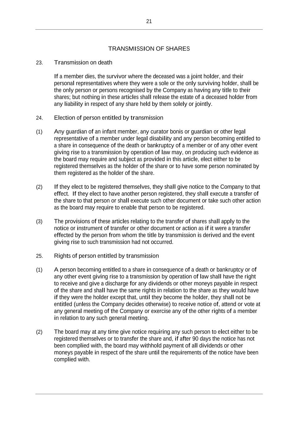 21 TRANSMISSION OF SHARES 23. Transmission on death If a member dies, the survivor where the deceased was a joint holder, and their personal representatives where they were a sole or the only surviving holder, shall be the only person or persons recognised by the Company as having any title to their shares; but nothing in these articles shall release the estate of a deceased holder from any liability in respect of any share held by them solely or jointly. 24. Election of person entitled by transmission (1) Any guardian of an infant member, any curator bonis or guardian or other legal representative of a member under legal disability and any person becoming entitled to a share in consequence of the death or bankruptcy of a member or of any other event giving rise to a transmission by operation of law may, on producing such evidence as the board may require and subject as provided in this article, elect either to be registered themselves as the holder of the share or to have some person nominated by them registered as the holder of the share. (2) If they elect to be registered themselves, they shall give notice to the Company to that effect. If they elect to have another person registered, they shall execute a transfer of the share to that person or shall execute such other document or take such other action as the board may require to enable that person to be registered. (3) The provisions of these articles relating to the transfer of shares shall apply to the notice or instrument of transfer or other document or action as if it were a transfer effected by the person from whom the title by transmission is derived and the event giving rise to such transmission had not occurred. 25. Rights of person entitled by transmission (1) A person becoming entitled to a share in consequence of a death or bankruptcy or of any other event giving rise to a transmission by operation of law shall have the right to receive and give a discharge for any dividends or other moneys payable in respect of the share and shall have the same rights in relation to the share as they would have if they were the holder except that, until they become the holder, they shall not be entitled (unless the Company decides otherwise) to receive notice of, attend or vote at any general meeting of the Company or exercise any of the other rights of a member in relation to any such general meeting. (2) The board may at any time give notice requiring any such person to elect either to be registered themselves or to transfer the share and, if after 90 days the notice has not been complied with, the board may withhold payment of all dividends or other moneys payable in respect of the share until the requirements of the notice have been complied with.