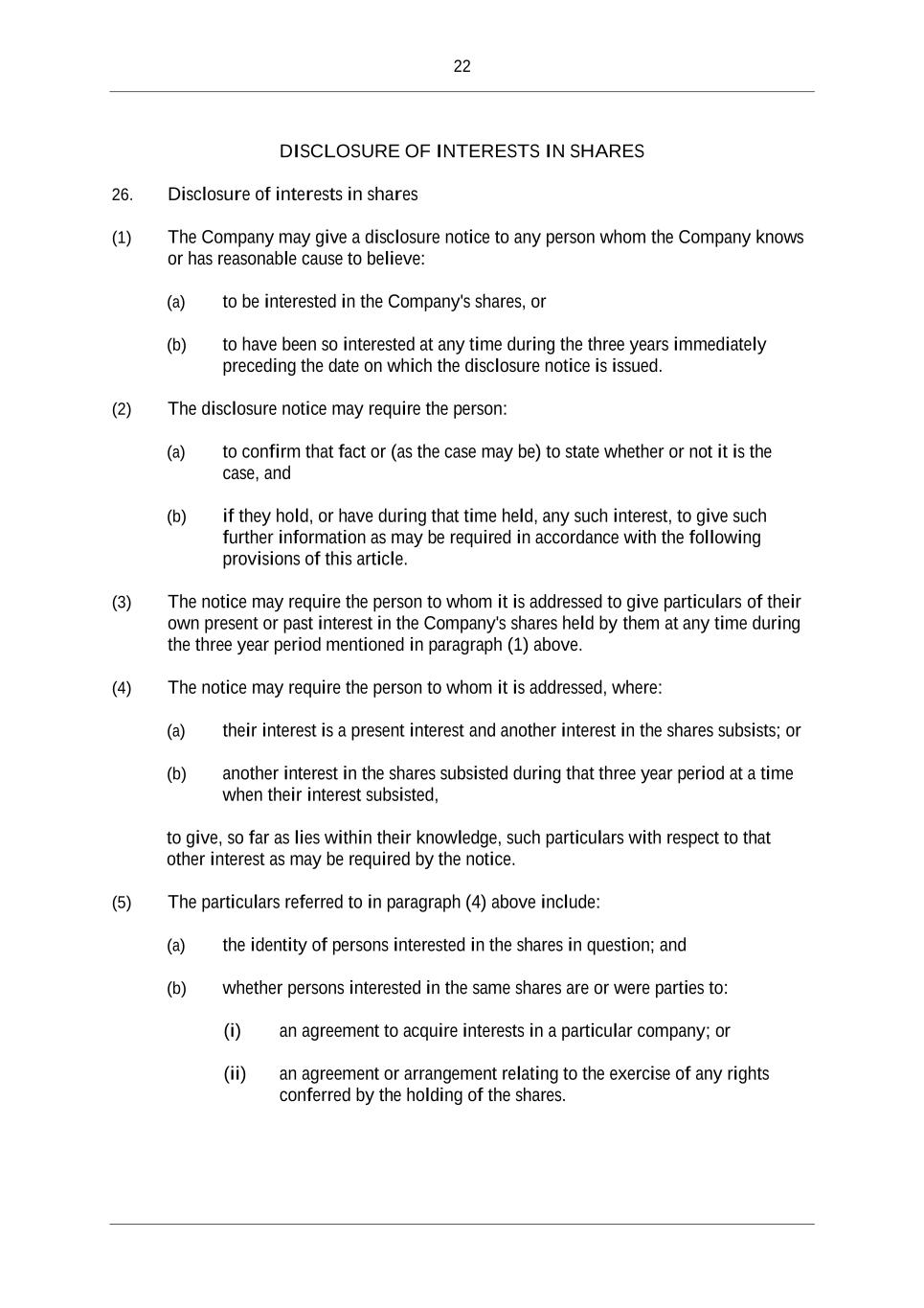 22 DISCLOSURE OF INTERESTS IN SHARES 26. Disclosure of interests in shares (1) The Company may give a disclosure notice to any person whom the Company knows or has reasonable cause to believe: (a) to be interested in the Company's shares, or (b) to have been so interested at any time during the three years immediately preceding the date on which the disclosure notice is issued. (2) The disclosure notice may require the person: (a) to confirm that fact or (as the case may be) to state whether or not it is the case, and (b) if they hold, or have during that time held, any such interest, to give such further information as may be required in accordance with the following provisions of this article. (3) The notice may require the person to whom it is addressed to give particulars of their own present or past interest in the Company's shares held by them at any time during the three year period mentioned in paragraph (1) above. (4) The notice may require the person to whom it is addressed, where: (a) their interest is a present interest and another interest in the shares subsists; or (b) another interest in the shares subsisted during that three year period at a time when their interest subsisted, to give, so far as lies within their knowledge, such particulars with respect to that other interest as may be required by the notice. (5) The particulars referred to in paragraph (4) above include: (a) the identity of persons interested in the shares in question; and (b) whether persons interested in the same shares are or were parties to: (i) an agreement to acquire interests in a particular company; or (ii) an agreement or arrangement relating to the exercise of any rights conferred by the holding of the shares.
