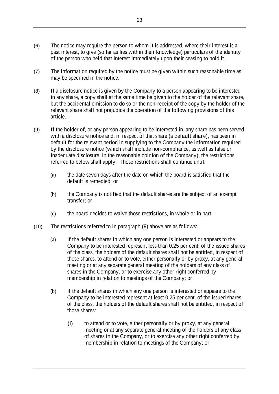 23 (6) The notice may require the person to whom it is addressed, where their interest is a past interest, to give (so far as lies within their knowledge) particulars of the identity of the person who held that interest immediately upon their ceasing to hold it. (7) The information required by the notice must be given within such reasonable time as may be specified in the notice. (8) If a disclosure notice is given by the Company to a person appearing to be interested in any share, a copy shall at the same time be given to the holder of the relevant share, but the accidental omission to do so or the non-receipt of the copy by the holder of the relevant share shall not prejudice the operation of the following provisions of this article. (9) If the holder of, or any person appearing to be interested in, any share has been served with a disclosure notice and, in respect of that share (a default share), has been in default for the relevant period in supplying to the Company the information required by the disclosure notice (which shall include non-compliance, as well as false or inadequate disclosure, in the reasonable opinion of the Company), the restrictions referred to below shall apply. Those restrictions shall continue until: (a) the date seven days after the date on which the board is satisfied that the default is remedied; or (b) the Company is notified that the default shares are the subject of an exempt transfer; or (c) the board decides to waive those restrictions, in whole or in part. (10) The restrictions referred to in paragraph (9) above are as follows: (a) if the default shares in which any one person is interested or appears to the Company to be interested represent less than 0.25 per cent. of the issued shares of the class, the holders of the default shares shall not be entitled, in respect of those shares, to attend or to vote, either personally or by proxy, at any general meeting or at any separate general meeting of the holders of any class of shares in the Company, or to exercise any other right conferred by membership in relation to meetings of the Company; or (b) if the default shares in which any one person is interested or appears to the Company to be interested represent at least 0.25 per cent. of the issued shares of the class, the holders of the default shares shall not be entitled, in respect of those shares: (i) to attend or to vote, either personally or by proxy, at any general meeting or at any separate general meeting of the holders of any class of shares in the Company, or to exercise any other right conferred by membership in relation to meetings of the Company; or