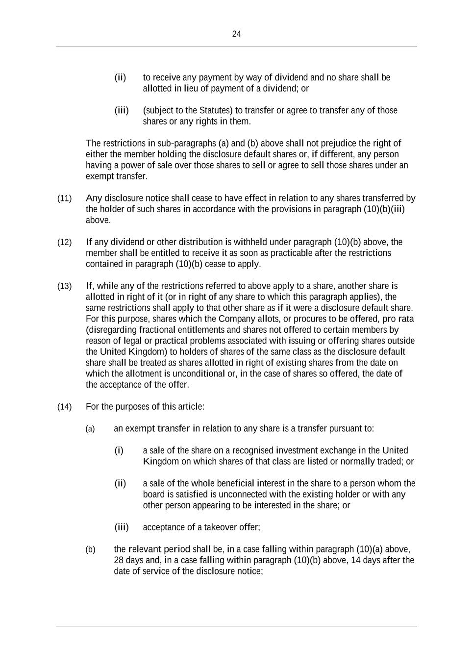 24 (ii) to receive any payment by way of dividend and no share shall be allotted in lieu of payment of a dividend; or (iii) (subject to the Statutes) to transfer or agree to transfer any of those shares or any rights in them. The restrictions in sub-paragraphs (a) and (b) above shall not prejudice the right of either the member holding the disclosure default shares or, if different, any person having a power of sale over those shares to sell or agree to sell those shares under an exempt transfer. (11) Any disclosure notice shall cease to have effect in relation to any shares transferred by the holder of such shares in accordance with the provisions in paragraph (10)(b)(iii) above. (12) If any dividend or other distribution is withheld under paragraph (10)(b) above, the member shall be entitled to receive it as soon as practicable after the restrictions contained in paragraph (10)(b) cease to apply. (13) If, while any of the restrictions referred to above apply to a share, another share is allotted in right of it (or in right of any share to which this paragraph applies), the same restrictions shall apply to that other share as if it were a disclosure default share. For this purpose, shares which the Company allots, or procures to be offered, pro rata (disregarding fractional entitlements and shares not offered to certain members by reason of legal or practical problems associated with issuing or offering shares outside the United Kingdom) to holders of shares of the same class as the disclosure default share shall be treated as shares allotted in right of existing shares from the date on which the allotment is unconditional or, in the case of shares so offered, the date of the acceptance of the offer. (14) For the purposes of this article: (a) an exempt transfer in relation to any share is a transfer pursuant to: (i) a sale of the share on a recognised investment exchange in the United Kingdom on which shares of that class are listed or normally traded; or (ii) a sale of the whole beneficial interest in the share to a person whom the board is satisfied is unconnected with the existing holder or with any other person appearing to be interested in the share; or (iii) acceptance of a takeover offer; (b) the relevant period shall be, in a case falling within paragraph (10)(a) above, 28 days and, in a case falling within paragraph (10)(b) above, 14 days after the date of service of the disclosure notice;