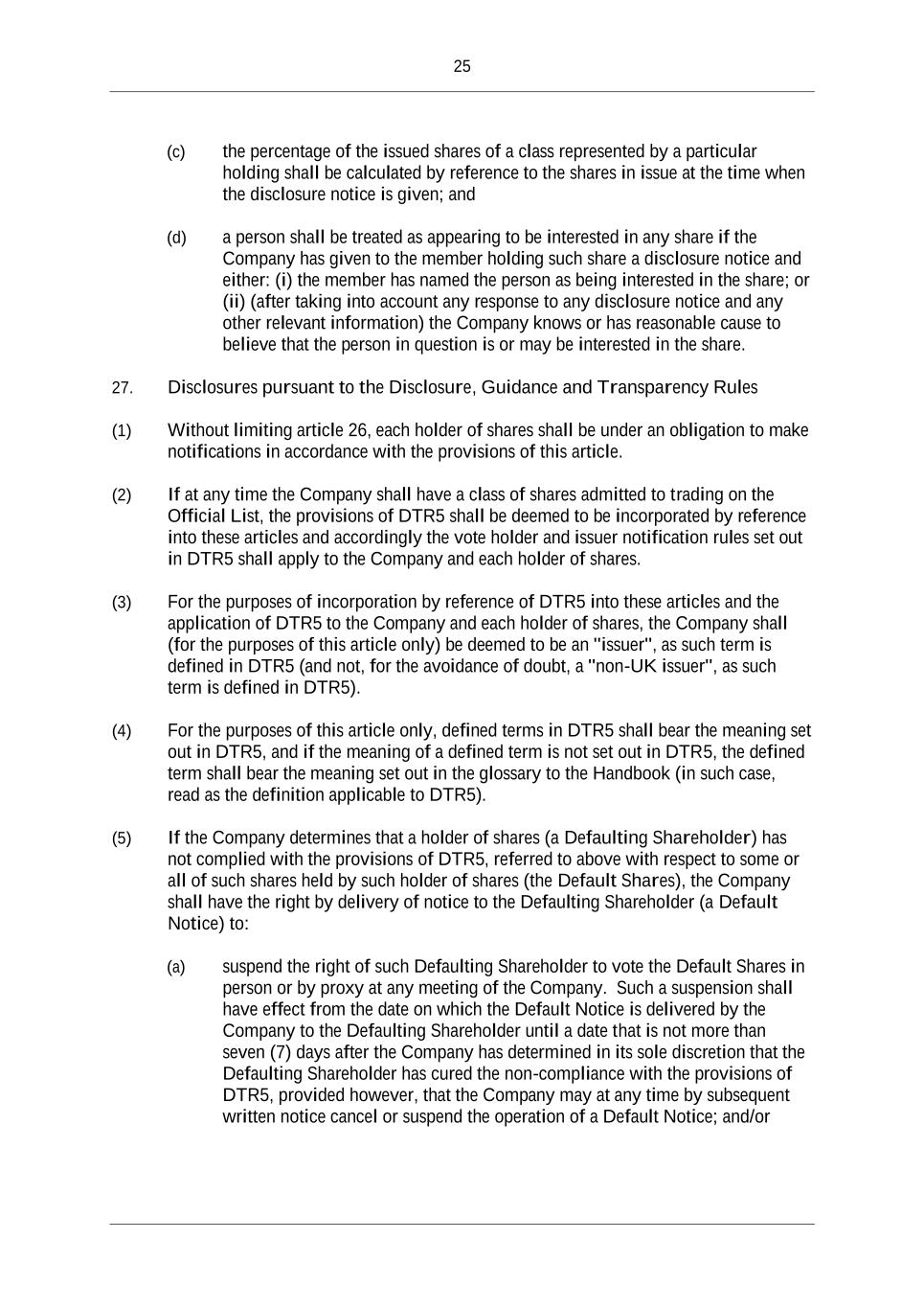 25 (c) the percentage of the issued shares of a class represented by a particular holding shall be calculated by reference to the shares in issue at the time when the disclosure notice is given; and (d) a person shall be treated as appearing to be interested in any share if the Company has given to the member holding such share a disclosure notice and either: (i) the member has named the person as being interested in the share; or (ii) (after taking into account any response to any disclosure notice and any other relevant information) the Company knows or has reasonable cause to believe that the person in question is or may be interested in the share. 27. Disclosures pursuant to the Disclosure, Guidance and Transparency Rules (1) Without limiting article 26, each holder of shares shall be under an obligation to make notifications in accordance with the provisions of this article. (2) If at any time the Company shall have a class of shares admitted to trading on the Official List, the provisions of DTR5 shall be deemed to be incorporated by reference into these articles and accordingly the vote holder and issuer notification rules set out in DTR5 shall apply to the Company and each holder of shares. (3) For the purposes of incorporation by reference of DTR5 into these articles and the application of DTR5 to the Company and each holder of shares, the Company shall (for the purposes of this article only) be deemed to be an "issuer", as such term is defined in DTR5 (and not, for the avoidance of doubt, a "non-UK issuer", as such term is defined in DTR5). (4) For the purposes of this article only, defined terms in DTR5 shall bear the meaning set out in DTR5, and if the meaning of a defined term is not set out in DTR5, the defined term shall bear the meaning set out in the glossary to the Handbook (in such case, read as the definition applicable to DTR5). (5) If the Company determines that a holder of shares (a Defaulting Shareholder) has not complied with the provisions of DTR5, referred to above with respect to some or all of such shares held by such holder of shares (the Default Shares), the Company shall have the right by delivery of notice to the Defaulting Shareholder (a Default Notice) to: (a) suspend the right of such Defaulting Shareholder to vote the Default Shares in person or by proxy at any meeting of the Company. Such a suspension shall have effect from the date on which the Default Notice is delivered by the Company to the Defaulting Shareholder until a date that is not more than seven (7) days after the Company has determined in its sole discretion that the Defaulting Shareholder has cured the non-compliance with the provisions of DTR5, provided however, that the Company may at any time by subsequent written notice cancel or suspend the operation of a Default Notice; and/or