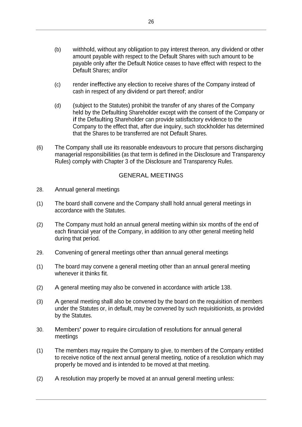 26 (b) withhold, without any obligation to pay interest thereon, any dividend or other amount payable with respect to the Default Shares with such amount to be payable only after the Default Notice ceases to have effect with respect to the Default Shares; and/or (c) render ineffective any election to receive shares of the Company instead of cash in respect of any dividend or part thereof; and/or (d) (subject to the Statutes) prohibit the transfer of any shares of the Company held by the Defaulting Shareholder except with the consent of the Company or if the Defaulting Shareholder can provide satisfactory evidence to the Company to the effect that, after due inquiry, such stockholder has determined that the Shares to be transferred are not Default Shares. (6) The Company shall use its reasonable endeavours to procure that persons discharging managerial responsibilities (as that term is defined in the Disclosure and Transparency Rules) comply with Chapter 3 of the Disclosure and Transparency Rules. GENERAL MEETINGS 28. Annual general meetings (1) The board shall convene and the Company shall hold annual general meetings in accordance with the Statutes. (2) The Company must hold an annual general meeting within six months of the end of each financial year of the Company, in addition to any other general meeting held during that period. 29. Convening of general meetings other than annual general meetings (1) The board may convene a general meeting other than an annual general meeting whenever it thinks fit. (2) A general meeting may also be convened in accordance with article 138. (3) A general meeting shall also be convened by the board on the requisition of members under the Statutes or, in default, may be convened by such requisitionists, as provided by the Statutes. 30. Members' power to require circulation of resolutions for annual general meetings (1) The members may require the Company to give, to members of the Company entitled to receive notice of the next annual general meeting, notice of a resolution which may properly be moved and is intended to be moved at that meeting. (2) A resolution may properly be moved at an annual general meeting unless:
