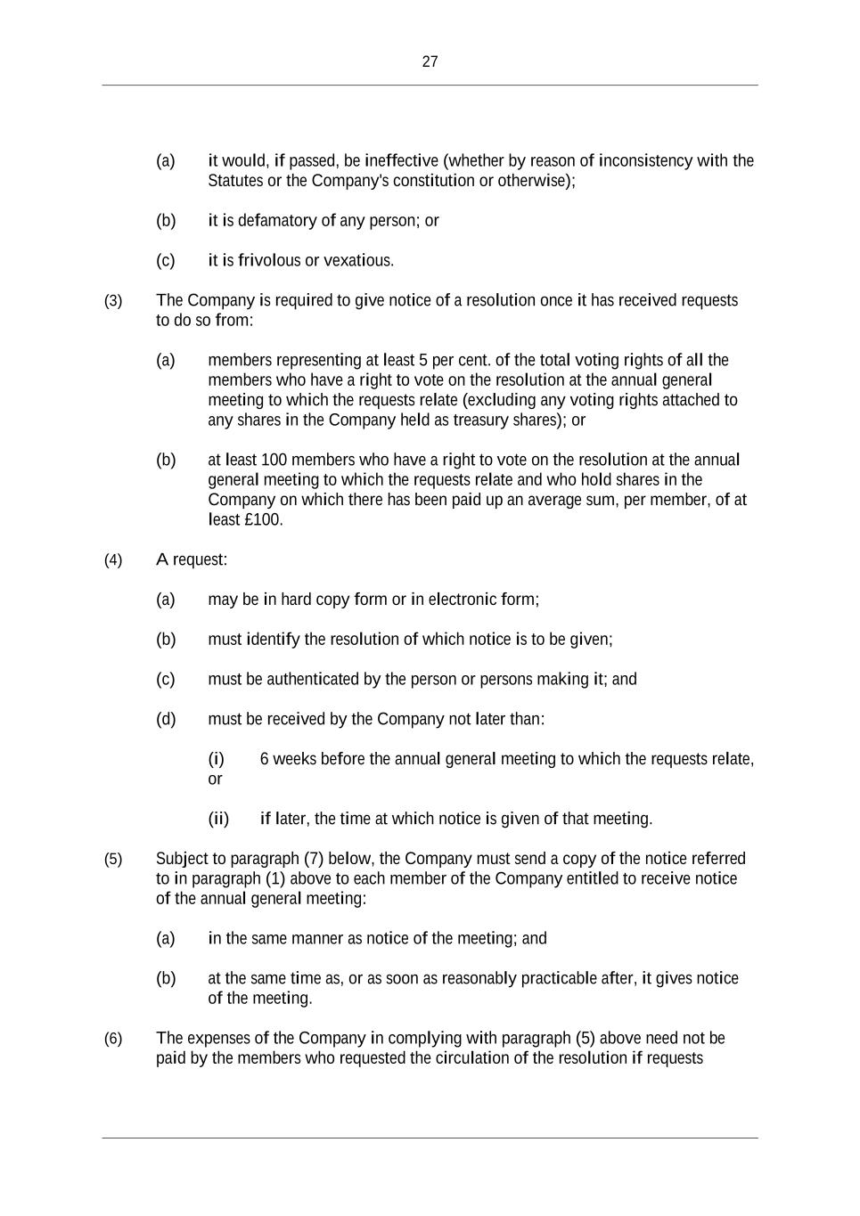 27 (a) it would, if passed, be ineffective (whether by reason of inconsistency with the Statutes or the Company's constitution or otherwise); (b) it is defamatory of any person; or (c) it is frivolous or vexatious. (3) The Company is required to give notice of a resolution once it has received requests to do so from: (a) members representing at least 5 per cent. of the total voting rights of all the members who have a right to vote on the resolution at the annual general meeting to which the requests relate (excluding any voting rights attached to any shares in the Company held as treasury shares); or (b) at least 100 members who have a right to vote on the resolution at the annual general meeting to which the requests relate and who hold shares in the Company on which there has been paid up an average sum, per member, of at least £100. (4) A request: (a) may be in hard copy form or in electronic form; (b) must identify the resolution of which notice is to be given; (c) must be authenticated by the person or persons making it; and (d) must be received by the Company not later than: (i) 6 weeks before the annual general meeting to which the requests relate, or (ii) if later, the time at which notice is given of that meeting. (5) Subject to paragraph (7) below, the Company must send a copy of the notice referred to in paragraph (1) above to each member of the Company entitled to receive notice of the annual general meeting: (a) in the same manner as notice of the meeting; and (b) at the same time as, or as soon as reasonably practicable after, it gives notice of the meeting. (6) The expenses of the Company in complying with paragraph (5) above need not be paid by the members who requested the circulation of the resolution if requests