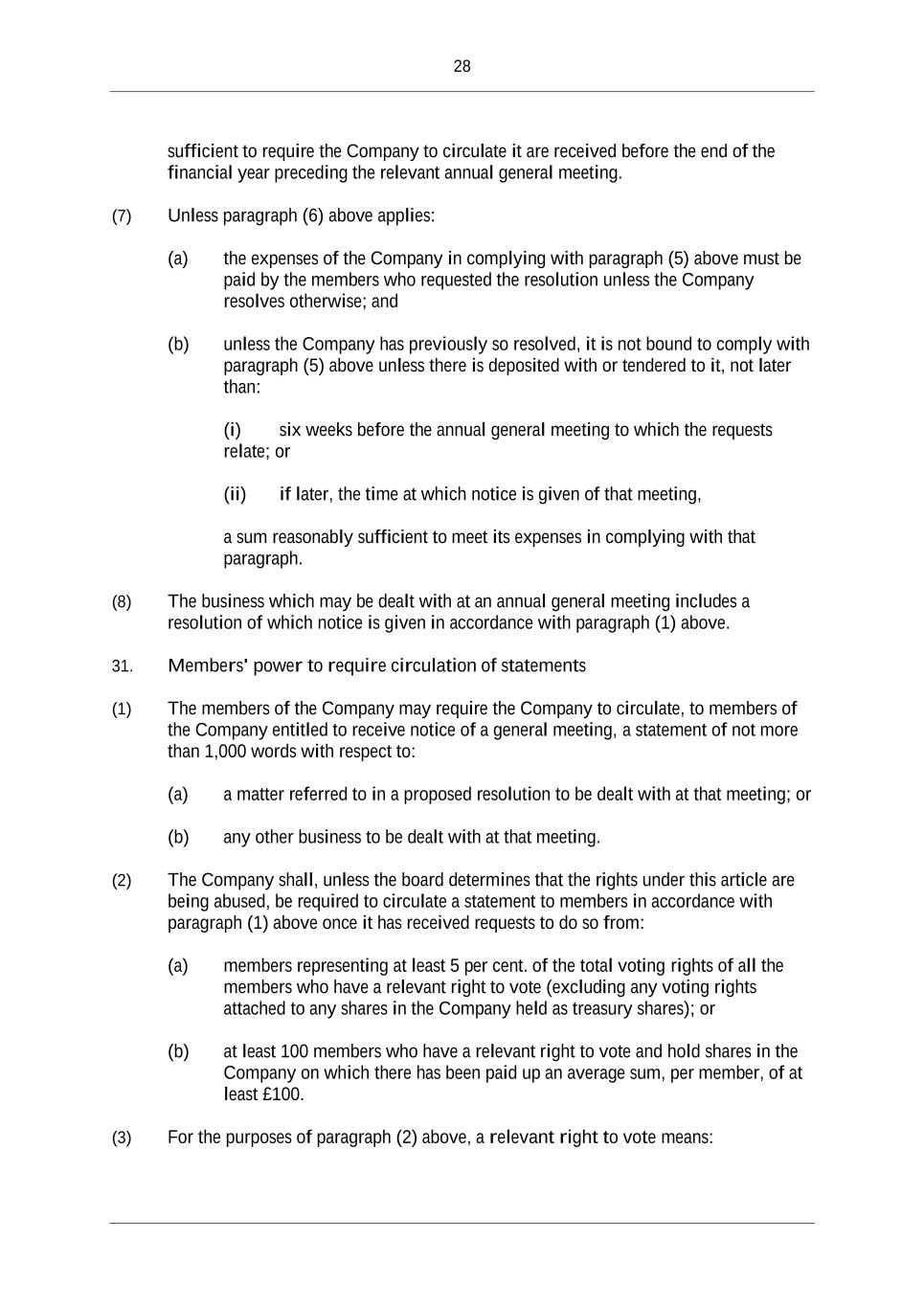 28 sufficient to require the Company to circulate it are received before the end of the financial year preceding the relevant annual general meeting. (7) Unless paragraph (6) above applies: (a) the expenses of the Company in complying with paragraph (5) above must be paid by the members who requested the resolution unless the Company resolves otherwise; and (b) unless the Company has previously so resolved, it is not bound to comply with paragraph (5) above unless there is deposited with or tendered to it, not later than: (i) six weeks before the annual general meeting to which the requests relate; or (ii) if later, the time at which notice is given of that meeting, a sum reasonably sufficient to meet its expenses in complying with that paragraph. (8) The business which may be dealt with at an annual general meeting includes a resolution of which notice is given in accordance with paragraph (1) above. 31. Members' power to require circulation of statements (1) The members of the Company may require the Company to circulate, to members of the Company entitled to receive notice of a general meeting, a statement of not more than 1,000 words with respect to: (a) a matter referred to in a proposed resolution to be dealt with at that meeting; or (b) any other business to be dealt with at that meeting. (2) The Company shall, unless the board determines that the rights under this article are being abused, be required to circulate a statement to members in accordance with paragraph (1) above once it has received requests to do so from: (a) members representing at least 5 per cent. of the total voting rights of all the members who have a relevant right to vote (excluding any voting rights attached to any shares in the Company held as treasury shares); or (b) at least 100 members who have a relevant right to vote and hold shares in the Company on which there has been paid up an average sum, per member, of at least £100. (3) For the purposes of paragraph (2) above, a relevant right to vote means: