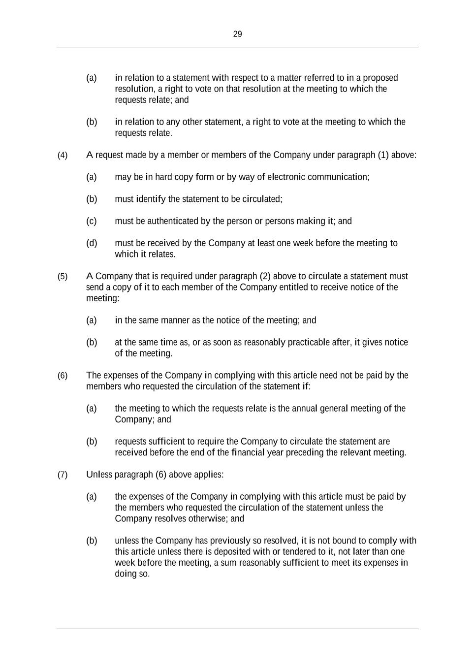 29 (a) in relation to a statement with respect to a matter referred to in a proposed resolution, a right to vote on that resolution at the meeting to which the requests relate; and (b) in relation to any other statement, a right to vote at the meeting to which the requests relate. (4) A request made by a member or members of the Company under paragraph (1) above: (a) may be in hard copy form or by way of electronic communication; (b) must identify the statement to be circulated; (c) must be authenticated by the person or persons making it; and (d) must be received by the Company at least one week before the meeting to which it relates. (5) A Company that is required under paragraph (2) above to circulate a statement must send a copy of it to each member of the Company entitled to receive notice of the meeting: (a) in the same manner as the notice of the meeting; and (b) at the same time as, or as soon as reasonably practicable after, it gives notice of the meeting. (6) The expenses of the Company in complying with this article need not be paid by the members who requested the circulation of the statement if: (a) the meeting to which the requests relate is the annual general meeting of the Company; and (b) requests sufficient to require the Company to circulate the statement are received before the end of the financial year preceding the relevant meeting. (7) Unless paragraph (6) above applies: (a) the expenses of the Company in complying with this article must be paid by the members who requested the circulation of the statement unless the Company resolves otherwise; and (b) unless the Company has previously so resolved, it is not bound to comply with this article unless there is deposited with or tendered to it, not later than one week before the meeting, a sum reasonably sufficient to meet its expenses in doing so.