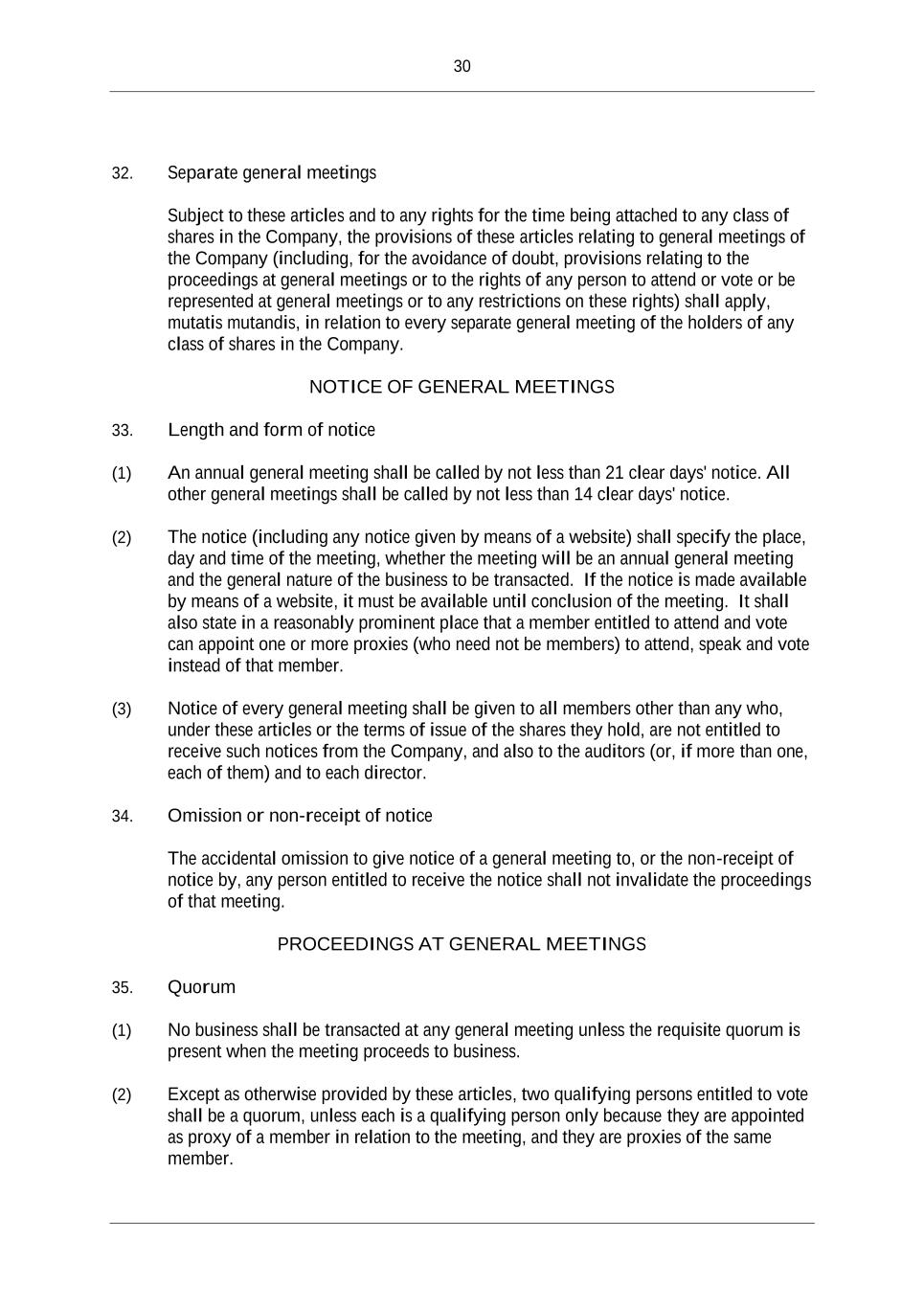 30 32. Separate general meetings Subject to these articles and to any rights for the time being attached to any class of shares in the Company, the provisions of these articles relating to general meetings of the Company (including, for the avoidance of doubt, provisions relating to the proceedings at general meetings or to the rights of any person to attend or vote or be represented at general meetings or to any restrictions on these rights) shall apply, mutatis mutandis, in relation to every separate general meeting of the holders of any class of shares in the Company. NOTICE OF GENERAL MEETINGS 33. Length and form of notice (1) An annual general meeting shall be called by not less than 21 clear days' notice. All other general meetings shall be called by not less than 14 clear days' notice. (2) The notice (including any notice given by means of a website) shall specify the place, day and time of the meeting, whether the meeting will be an annual general meeting and the general nature of the business to be transacted. If the notice is made available by means of a website, it must be available until conclusion of the meeting. It shall also state in a reasonably prominent place that a member entitled to attend and vote can appoint one or more proxies (who need not be members) to attend, speak and vote instead of that member. (3) Notice of every general meeting shall be given to all members other than any who, under these articles or the terms of issue of the shares they hold, are not entitled to receive such notices from the Company, and also to the auditors (or, if more than one, each of them) and to each director. 34. Omission or non-receipt of notice The accidental omission to give notice of a general meeting to, or the non-receipt of notice by, any person entitled to receive the notice shall not invalidate the proceedings of that meeting. PROCEEDINGS AT GENERAL MEETINGS 35. Quorum (1) No business shall be transacted at any general meeting unless the requisite quorum is present when the meeting proceeds to business. (2) Except as otherwise provided by these articles, two qualifying persons entitled to vote shall be a quorum, unless each is a qualifying person only because they are appointed as proxy of a member in relation to the meeting, and they are proxies of the same member.