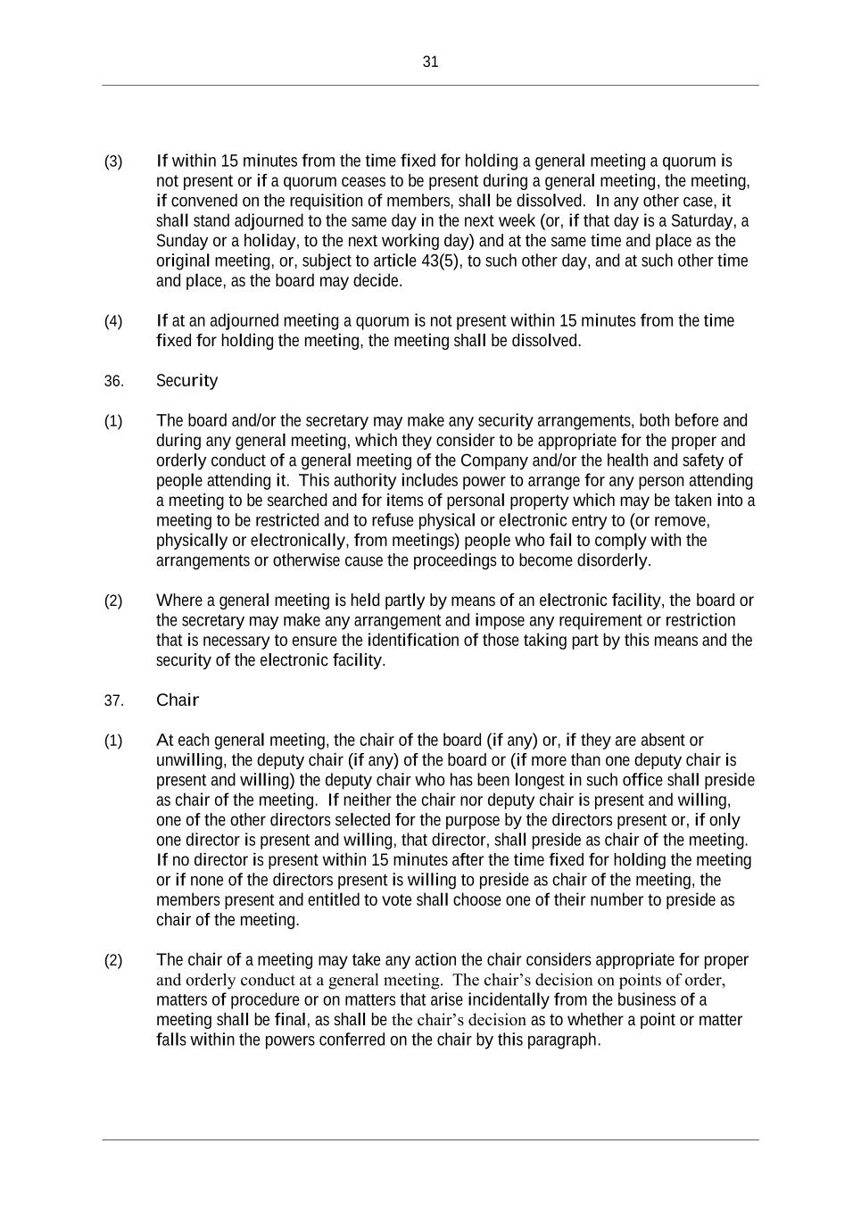31 (3) If within 15 minutes from the time fixed for holding a general meeting a quorum is not present or if a quorum ceases to be present during a general meeting, the meeting, if convened on the requisition of members, shall be dissolved. In any other case, it shall stand adjourned to the same day in the next week (or, if that day is a Saturday, a Sunday or a holiday, to the next working day) and at the same time and place as the original meeting, or, subject to article 43(5), to such other day, and at such other time and place, as the board may decide. (4) If at an adjourned meeting a quorum is not present within 15 minutes from the time fixed for holding the meeting, the meeting shall be dissolved. 36. Security (1) The board and/or the secretary may make any security arrangements, both before and during any general meeting, which they consider to be appropriate for the proper and orderly conduct of a general meeting of the Company and/or the health and safety of people attending it. This authority includes power to arrange for any person attending a meeting to be searched and for items of personal property which may be taken into a meeting to be restricted and to refuse physical or electronic entry to (or remove, physically or electronically, from meetings) people who fail to comply with the arrangements or otherwise cause the proceedings to become disorderly. (2) Where a general meeting is held partly by means of an electronic facility, the board or the secretary may make any arrangement and impose any requirement or restriction that is necessary to ensure the identification of those taking part by this means and the security of the electronic facility. 37. Chair (1) At each general meeting, the chair of the board (if any) or, if they are absent or unwilling, the deputy chair (if any) of the board or (if more than one deputy chair is present and willing) the deputy chair who has been longest in such office shall preside as chair of the meeting. If neither the chair nor deputy chair is present and willing, one of the other directors selected for the purpose by the directors present or, if only one director is present and willing, that director, shall preside as chair of the meeting. If no director is present within 15 minutes after the time fixed for holding the meeting or if none of the directors present is willing to preside as chair of the meeting, the members present and entitled to vote shall choose one of their number to preside as chair of the meeting. (2) The chair of a meeting may take any action the chair considers appropriate for proper and orderly conduct at a general meeting. The chair’s decision on points of order, matters of procedure or on matters that arise incidentally from the business of a meeting shall be final, as shall be the chair’s decision as to whether a point or matter falls within the powers conferred on the chair by this paragraph.