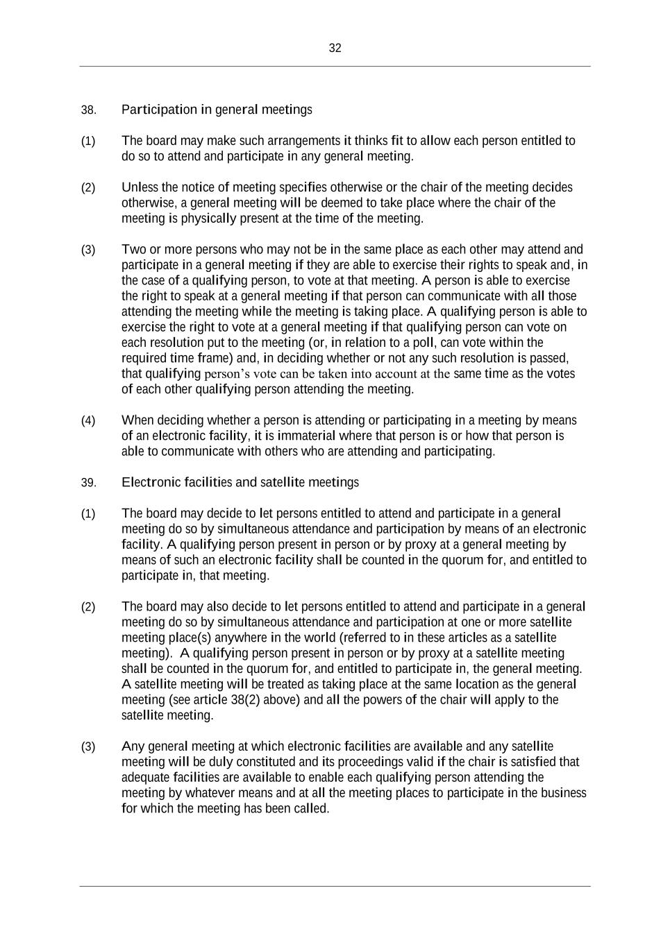 32 38. Participation in general meetings (1) The board may make such arrangements it thinks fit to allow each person entitled to do so to attend and participate in any general meeting. (2) Unless the notice of meeting specifies otherwise or the chair of the meeting decides otherwise, a general meeting will be deemed to take place where the chair of the meeting is physically present at the time of the meeting. (3) Two or more persons who may not be in the same place as each other may attend and participate in a general meeting if they are able to exercise their rights to speak and, in the case of a qualifying person, to vote at that meeting. A person is able to exercise the right to speak at a general meeting if that person can communicate with all those attending the meeting while the meeting is taking place. A qualifying person is able to exercise the right to vote at a general meeting if that qualifying person can vote on each resolution put to the meeting (or, in relation to a poll, can vote within the required time frame) and, in deciding whether or not any such resolution is passed, that qualifying person’s vote can be taken into account at the same time as the votes of each other qualifying person attending the meeting. (4) When deciding whether a person is attending or participating in a meeting by means of an electronic facility, it is immaterial where that person is or how that person is able to communicate with others who are attending and participating. 39. Electronic facilities and satellite meetings (1) The board may decide to let persons entitled to attend and participate in a general meeting do so by simultaneous attendance and participation by means of an electronic facility. A qualifying person present in person or by proxy at a general meeting by means of such an electronic facility shall be counted in the quorum for, and entitled to participate in, that meeting. (2) The board may also decide to let persons entitled to attend and participate in a general meeting do so by simultaneous attendance and participation at one or more satellite meeting place(s) anywhere in the world (referred to in these articles as a satellite meeting). A qualifying person present in person or by proxy at a satellite meeting shall be counted in the quorum for, and entitled to participate in, the general meeting. A satellite meeting will be treated as taking place at the same location as the general meeting (see article 38(2) above) and all the powers of the chair will apply to the satellite meeting. (3) Any general meeting at which electronic facilities are available and any satellite meeting will be duly constituted and its proceedings valid if the chair is satisfied that adequate facilities are available to enable each qualifying person attending the meeting by whatever means and at all the meeting places to participate in the business for which the meeting has been called.