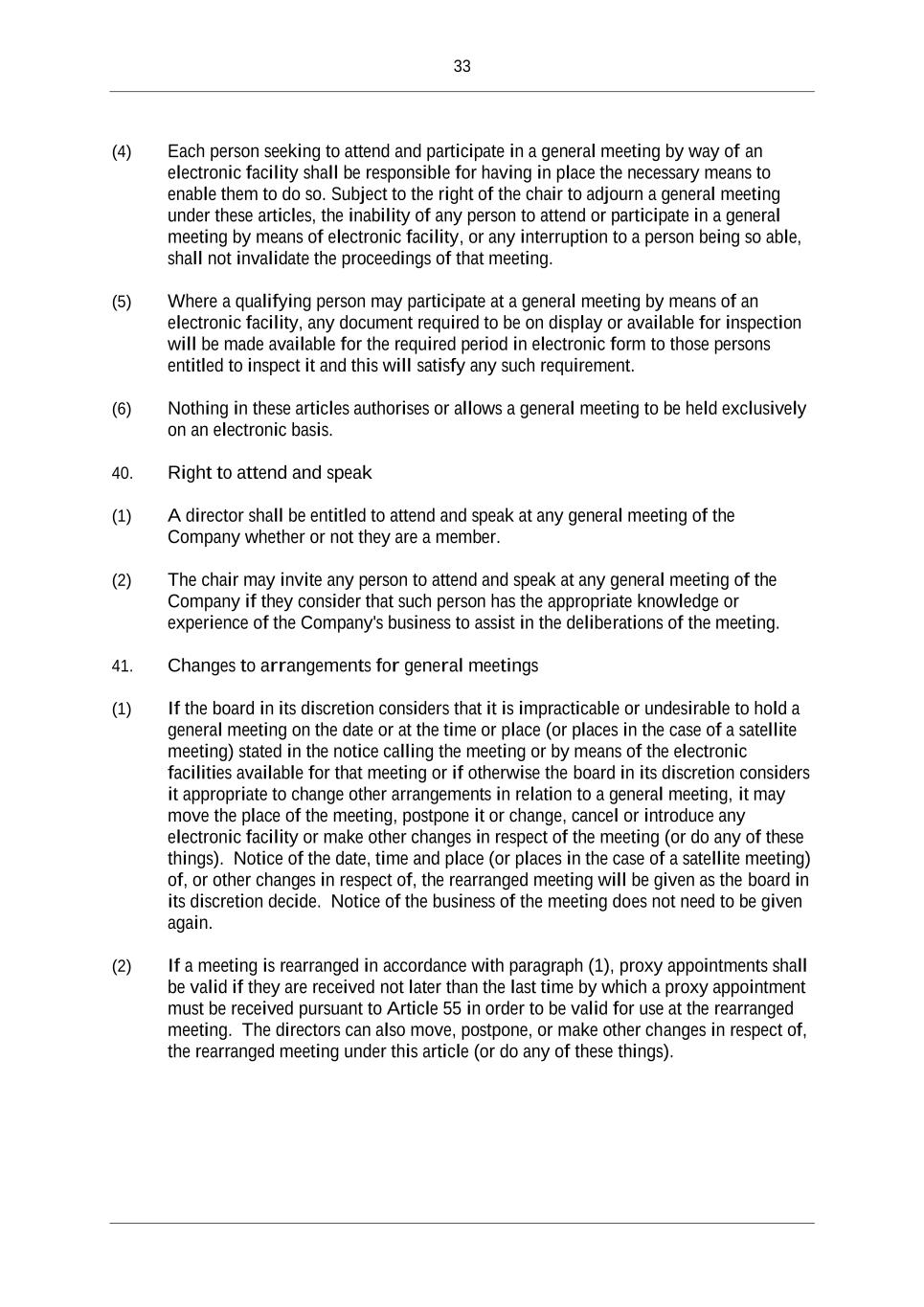 33 (4) Each person seeking to attend and participate in a general meeting by way of an electronic facility shall be responsible for having in place the necessary means to enable them to do so. Subject to the right of the chair to adjourn a general meeting under these articles, the inability of any person to attend or participate in a general meeting by means of electronic facility, or any interruption to a person being so able, shall not invalidate the proceedings of that meeting. (5) Where a qualifying person may participate at a general meeting by means of an electronic facility, any document required to be on display or available for inspection will be made available for the required period in electronic form to those persons entitled to inspect it and this will satisfy any such requirement. (6) Nothing in these articles authorises or allows a general meeting to be held exclusively on an electronic basis. 40. Right to attend and speak (1) A director shall be entitled to attend and speak at any general meeting of the Company whether or not they are a member. (2) The chair may invite any person to attend and speak at any general meeting of the Company if they consider that such person has the appropriate knowledge or experience of the Company's business to assist in the deliberations of the meeting. 41. Changes to arrangements for general meetings (1) If the board in its discretion considers that it is impracticable or undesirable to hold a general meeting on the date or at the time or place (or places in the case of a satellite meeting) stated in the notice calling the meeting or by means of the electronic facilities available for that meeting or if otherwise the board in its discretion considers it appropriate to change other arrangements in relation to a general meeting, it may move the place of the meeting, postpone it or change, cancel or introduce any electronic facility or make other changes in respect of the meeting (or do any of these things). Notice of the date, time and place (or places in the case of a satellite meeting) of, or other changes in respect of, the rearranged meeting will be given as the board in its discretion decide. Notice of the business of the meeting does not need to be given again. (2) If a meeting is rearranged in accordance with paragraph (1), proxy appointments shall be valid if they are received not later than the last time by which a proxy appointment must be received pursuant to Article 55 in order to be valid for use at the rearranged meeting. The directors can also move, postpone, or make other changes in respect of, the rearranged meeting under this article (or do any of these things).