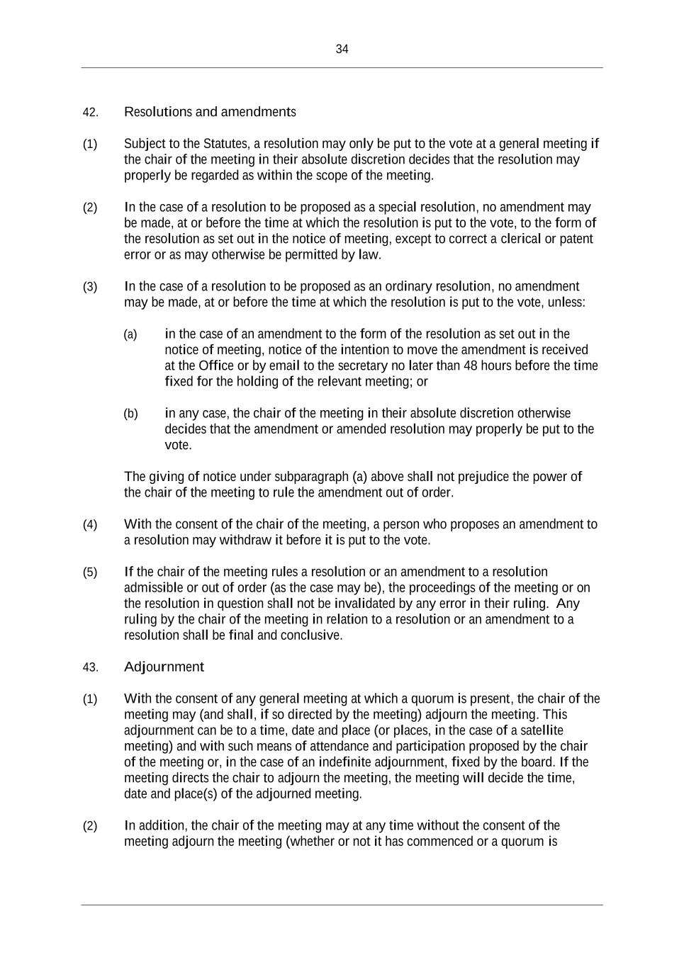 34 42. Resolutions and amendments (1) Subject to the Statutes, a resolution may only be put to the vote at a general meeting if the chair of the meeting in their absolute discretion decides that the resolution may properly be regarded as within the scope of the meeting. (2) In the case of a resolution to be proposed as a special resolution, no amendment may be made, at or before the time at which the resolution is put to the vote, to the form of the resolution as set out in the notice of meeting, except to correct a clerical or patent error or as may otherwise be permitted by law. (3) In the case of a resolution to be proposed as an ordinary resolution, no amendment may be made, at or before the time at which the resolution is put to the vote, unless: (a) in the case of an amendment to the form of the resolution as set out in the notice of meeting, notice of the intention to move the amendment is received at the Office or by email to the secretary no later than 48 hours before the time fixed for the holding of the relevant meeting; or (b) in any case, the chair of the meeting in their absolute discretion otherwise decides that the amendment or amended resolution may properly be put to the vote. The giving of notice under subparagraph (a) above shall not prejudice the power of the chair of the meeting to rule the amendment out of order. (4) With the consent of the chair of the meeting, a person who proposes an amendment to a resolution may withdraw it before it is put to the vote. (5) If the chair of the meeting rules a resolution or an amendment to a resolution admissible or out of order (as the case may be), the proceedings of the meeting or on the resolution in question shall not be invalidated by any error in their ruling. Any ruling by the chair of the meeting in relation to a resolution or an amendment to a resolution shall be final and conclusive. 43. Adjournment (1) With the consent of any general meeting at which a quorum is present, the chair of the meeting may (and shall, if so directed by the meeting) adjourn the meeting. This adjournment can be to a time, date and place (or places, in the case of a satellite meeting) and with such means of attendance and participation proposed by the chair of the meeting or, in the case of an indefinite adjournment, fixed by the board. If the meeting directs the chair to adjourn the meeting, the meeting will decide the time, date and place(s) of the adjourned meeting. (2) In addition, the chair of the meeting may at any time without the consent of the meeting adjourn the meeting (whether or not it has commenced or a quorum is