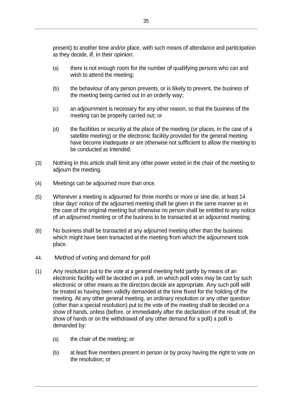 35 present) to another time and/or place, with such means of attendance and participation as they decide, if, in their opinion: (a) there is not enough room for the number of qualifying persons who can and wish to attend the meeting; (b) the behaviour of any person prevents, or is likely to prevent, the business of the meeting being carried out in an orderly way; (c) an adjournment is necessary for any other reason, so that the business of the meeting can be properly carried out; or (d) the facilities or security at the place of the meeting (or places, in the case of a satellite meeting) or the electronic facility provided for the general meeting have become inadequate or are otherwise not sufficient to allow the meeting to be conducted as intended. (3) Nothing in this article shall limit any other power vested in the chair of the meeting to adjourn the meeting. (4) Meetings can be adjourned more than once. (5) Whenever a meeting is adjourned for three months or more or sine die, at least 14 clear days' notice of the adjourned meeting shall be given in the same manner as in the case of the original meeting but otherwise no person shall be entitled to any notice of an adjourned meeting or of the business to be transacted at an adjourned meeting. (6) No business shall be transacted at any adjourned meeting other than the business which might have been transacted at the meeting from which the adjournment took place. 44. Method of voting and demand for poll (1) Any resolution put to the vote at a general meeting held partly by means of an electronic facility will be decided on a poll, on which poll votes may be cast by such electronic or other means as the directors decide are appropriate. Any such poll will be treated as having been validly demanded at the time fixed for the holding of the meeting. At any other general meeting, an ordinary resolution or any other question (other than a special resolution) put to the vote of the meeting shall be decided on a show of hands, unless (before, or immediately after the declaration of the result of, the show of hands or on the withdrawal of any other demand for a poll) a poll is demanded by: (a) the chair of the meeting; or (b) at least five members present in person or by proxy having the right to vote on the resolution; or