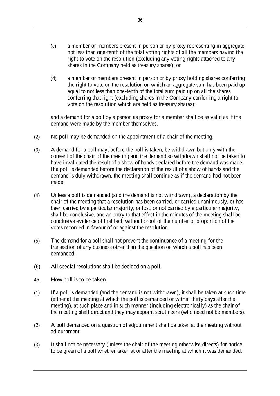 36 (c) a member or members present in person or by proxy representing in aggregate not less than one-tenth of the total voting rights of all the members having the right to vote on the resolution (excluding any voting rights attached to any shares in the Company held as treasury shares); or (d) a member or members present in person or by proxy holding shares conferring the right to vote on the resolution on which an aggregate sum has been paid up equal to not less than one-tenth of the total sum paid up on all the shares conferring that right (excluding shares in the Company conferring a right to vote on the resolution which are held as treasury shares); and a demand for a poll by a person as proxy for a member shall be as valid as if the demand were made by the member themselves. (2) No poll may be demanded on the appointment of a chair of the meeting. (3) A demand for a poll may, before the poll is taken, be withdrawn but only with the consent of the chair of the meeting and the demand so withdrawn shall not be taken to have invalidated the result of a show of hands declared before the demand was made. If a poll is demanded before the declaration of the result of a show of hands and the demand is duly withdrawn, the meeting shall continue as if the demand had not been made. (4) Unless a poll is demanded (and the demand is not withdrawn), a declaration by the chair of the meeting that a resolution has been carried, or carried unanimously, or has been carried by a particular majority, or lost, or not carried by a particular majority, shall be conclusive, and an entry to that effect in the minutes of the meeting shall be conclusive evidence of that fact, without proof of the number or proportion of the votes recorded in favour of or against the resolution. (5) The demand for a poll shall not prevent the continuance of a meeting for the transaction of any business other than the question on which a poll has been demanded. (6) All special resolutions shall be decided on a poll. 45. How poll is to be taken (1) If a poll is demanded (and the demand is not withdrawn), it shall be taken at such time (either at the meeting at which the poll is demanded or within thirty days after the meeting), at such place and in such manner (including electronically) as the chair of the meeting shall direct and they may appoint scrutineers (who need not be members). (2) A poll demanded on a question of adjournment shall be taken at the meeting without adjournment. (3) It shall not be necessary (unless the chair of the meeting otherwise directs) for notice to be given of a poll whether taken at or after the meeting at which it was demanded.