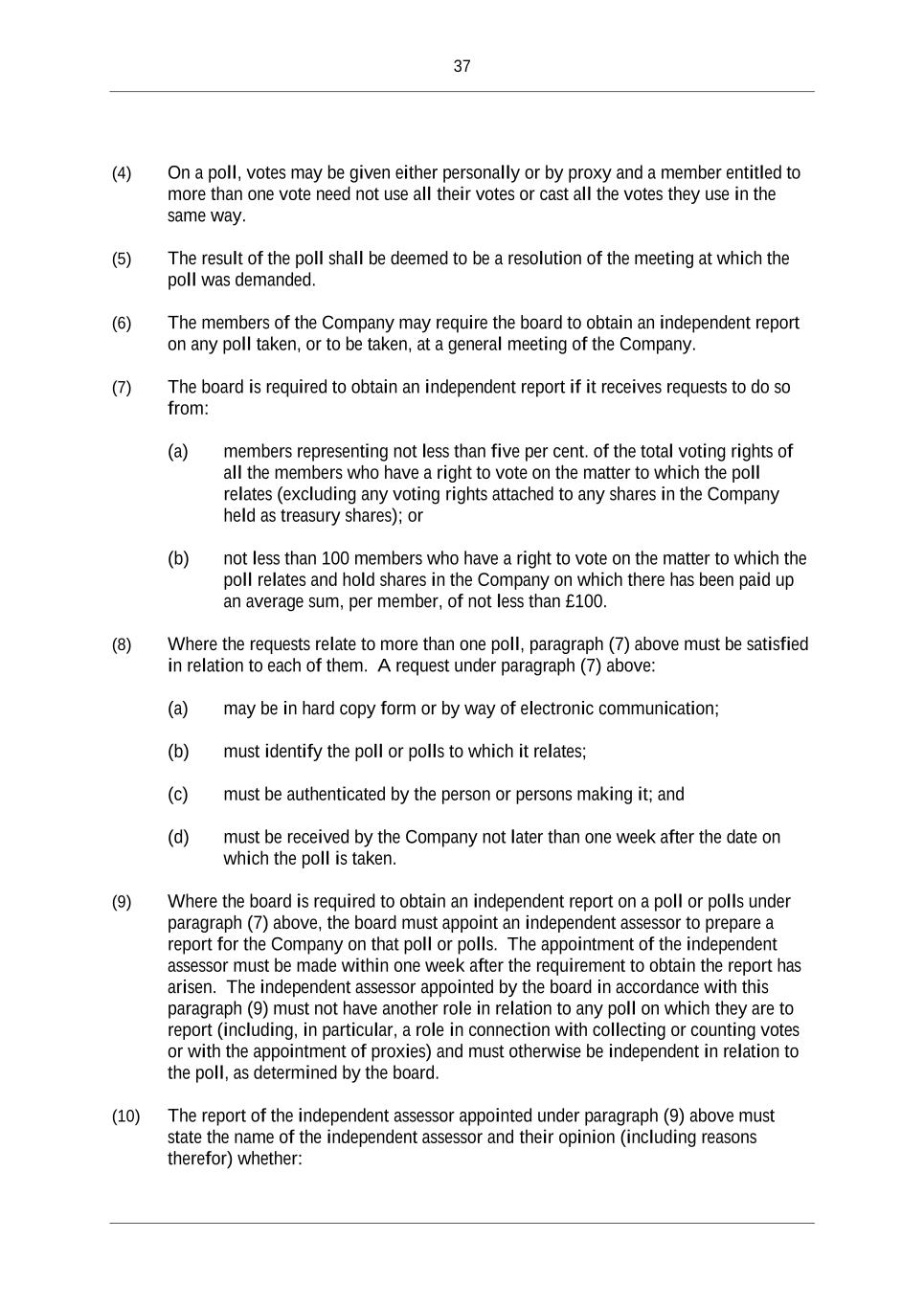 37 (4) On a poll, votes may be given either personally or by proxy and a member entitled to more than one vote need not use all their votes or cast all the votes they use in the same way. (5) The result of the poll shall be deemed to be a resolution of the meeting at which the poll was demanded. (6) The members of the Company may require the board to obtain an independent report on any poll taken, or to be taken, at a general meeting of the Company. (7) The board is required to obtain an independent report if it receives requests to do so from: (a) members representing not less than five per cent. of the total voting rights of all the members who have a right to vote on the matter to which the poll relates (excluding any voting rights attached to any shares in the Company held as treasury shares); or (b) not less than 100 members who have a right to vote on the matter to which the poll relates and hold shares in the Company on which there has been paid up an average sum, per member, of not less than £100. (8) Where the requests relate to more than one poll, paragraph (7) above must be satisfied in relation to each of them. A request under paragraph (7) above: (a) may be in hard copy form or by way of electronic communication; (b) must identify the poll or polls to which it relates; (c) must be authenticated by the person or persons making it; and (d) must be received by the Company not later than one week after the date on which the poll is taken. (9) Where the board is required to obtain an independent report on a poll or polls under paragraph (7) above, the board must appoint an independent assessor to prepare a report for the Company on that poll or polls. The appointment of the independent assessor must be made within one week after the requirement to obtain the report has arisen. The independent assessor appointed by the board in accordance with this paragraph (9) must not have another role in relation to any poll on which they are to report (including, in particular, a role in connection with collecting or counting votes or with the appointment of proxies) and must otherwise be independent in relation to the poll, as determined by the board. (10) The report of the independent assessor appointed under paragraph (9) above must state the name of the independent assessor and their opinion (including reasons therefor) whether: