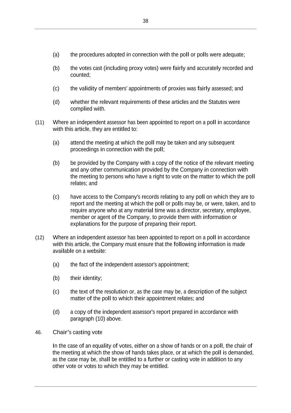 38 (a) the procedures adopted in connection with the poll or polls were adequate; (b) the votes cast (including proxy votes) were fairly and accurately recorded and counted; (c) the validity of members' appointments of proxies was fairly assessed; and (d) whether the relevant requirements of these articles and the Statutes were complied with. (11) Where an independent assessor has been appointed to report on a poll in accordance with this article, they are entitled to: (a) attend the meeting at which the poll may be taken and any subsequent proceedings in connection with the poll; (b) be provided by the Company with a copy of the notice of the relevant meeting and any other communication provided by the Company in connection with the meeting to persons who have a right to vote on the matter to which the poll relates; and (c) have access to the Company's records relating to any poll on which they are to report and the meeting at which the poll or polls may be, or were, taken, and to require anyone who at any material time was a director, secretary, employee, member or agent of the Company, to provide them with information or explanations for the purpose of preparing their report. (12) Where an independent assessor has been appointed to report on a poll in accordance with this article, the Company must ensure that the following information is made available on a website: (a) the fact of the independent assessor's appointment; (b) their identity; (c) the text of the resolution or, as the case may be, a description of the subject matter of the poll to which their appointment relates; and (d) a copy of the independent assessor's report prepared in accordance with paragraph (10) above. 46. Chair's casting vote In the case of an equality of votes, either on a show of hands or on a poll, the chair of the meeting at which the show of hands takes place, or at which the poll is demanded, as the case may be, shall be entitled to a further or casting vote in addition to any other vote or votes to which they may be entitled.