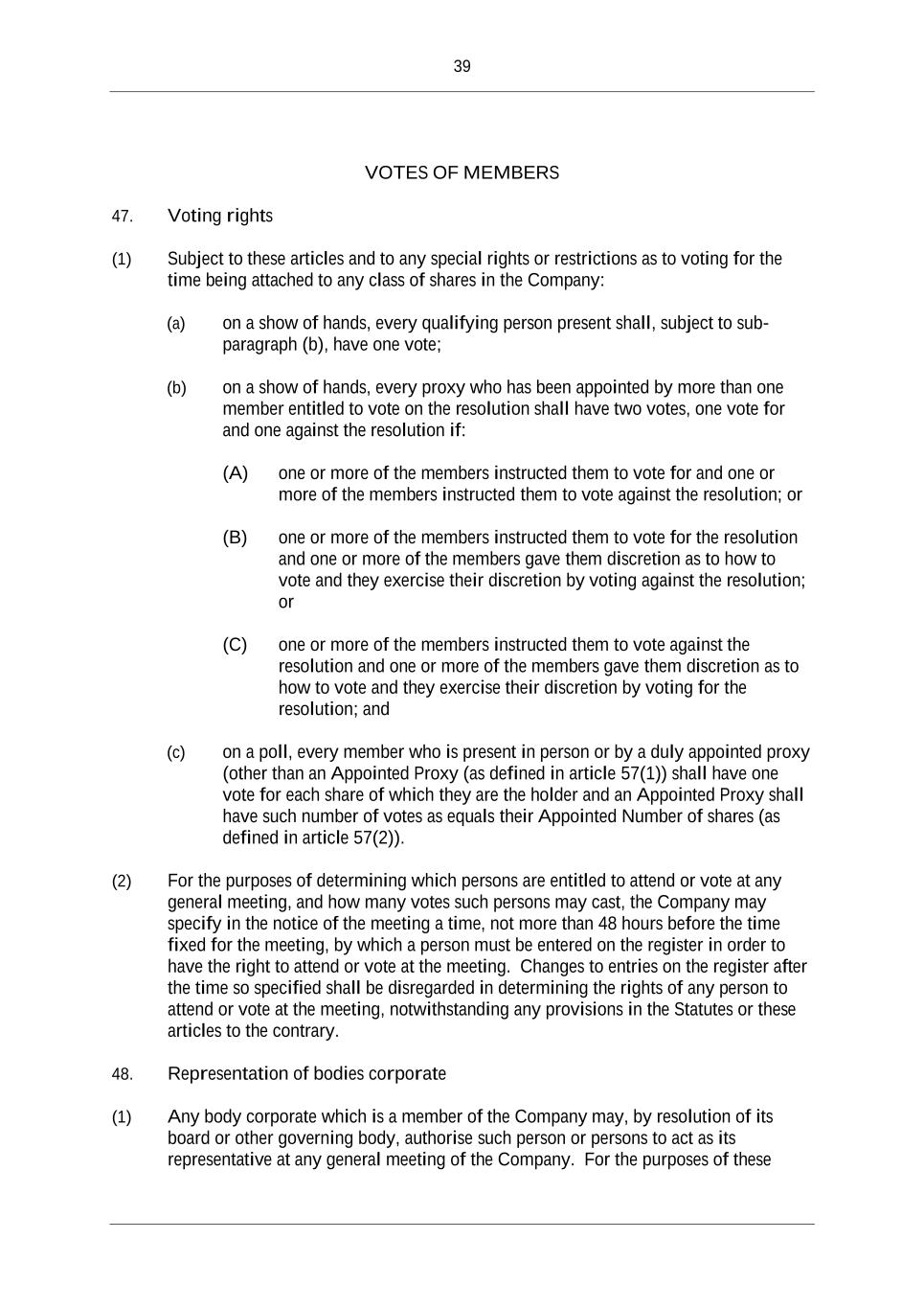 39 VOTES OF MEMBERS 47. Voting rights (1) Subject to these articles and to any special rights or restrictions as to voting for the time being attached to any class of shares in the Company: (a) on a show of hands, every qualifying person present shall, subject to sub- paragraph (b), have one vote; (b) on a show of hands, every proxy who has been appointed by more than one member entitled to vote on the resolution shall have two votes, one vote for and one against the resolution if: (A) one or more of the members instructed them to vote for and one or more of the members instructed them to vote against the resolution; or (B) one or more of the members instructed them to vote for the resolution and one or more of the members gave them discretion as to how to vote and they exercise their discretion by voting against the resolution; or (C) one or more of the members instructed them to vote against the resolution and one or more of the members gave them discretion as to how to vote and they exercise their discretion by voting for the resolution; and (c) on a poll, every member who is present in person or by a duly appointed proxy (other than an Appointed Proxy (as defined in article 57(1)) shall have one vote for each share of which they are the holder and an Appointed Proxy shall have such number of votes as equals their Appointed Number of shares (as defined in article 57(2)). (2) For the purposes of determining which persons are entitled to attend or vote at any general meeting, and how many votes such persons may cast, the Company may specify in the notice of the meeting a time, not more than 48 hours before the time fixed for the meeting, by which a person must be entered on the register in order to have the right to attend or vote at the meeting. Changes to entries on the register after the time so specified shall be disregarded in determining the rights of any person to attend or vote at the meeting, notwithstanding any provisions in the Statutes or these articles to the contrary. 48. Representation of bodies corporate (1) Any body corporate which is a member of the Company may, by resolution of its board or other governing body, authorise such person or persons to act as its representative at any general meeting of the Company. For the purposes of these