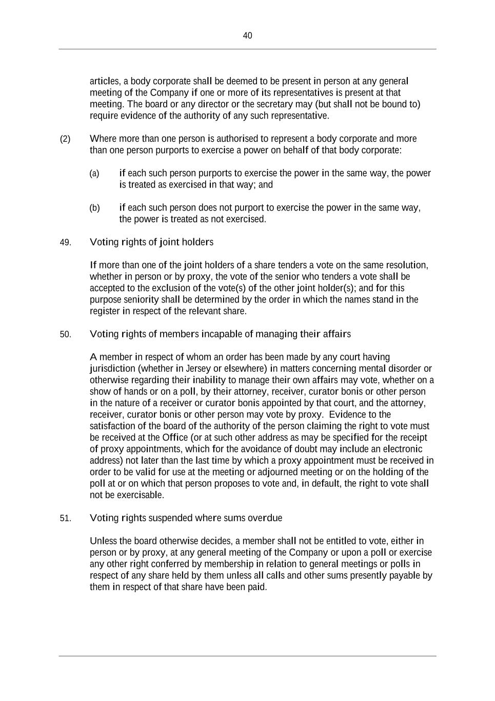 40 articles, a body corporate shall be deemed to be present in person at any general meeting of the Company if one or more of its representatives is present at that meeting. The board or any director or the secretary may (but shall not be bound to) require evidence of the authority of any such representative. (2) Where more than one person is authorised to represent a body corporate and more than one person purports to exercise a power on behalf of that body corporate: (a) if each such person purports to exercise the power in the same way, the power is treated as exercised in that way; and (b) if each such person does not purport to exercise the power in the same way, the power is treated as not exercised. 49. Voting rights of joint holders If more than one of the joint holders of a share tenders a vote on the same resolution, whether in person or by proxy, the vote of the senior who tenders a vote shall be accepted to the exclusion of the vote(s) of the other joint holder(s); and for this purpose seniority shall be determined by the order in which the names stand in the register in respect of the relevant share. 50. Voting rights of members incapable of managing their affairs A member in respect of whom an order has been made by any court having jurisdiction (whether in Jersey or elsewhere) in matters concerning mental disorder or otherwise regarding their inability to manage their own affairs may vote, whether on a show of hands or on a poll, by their attorney, receiver, curator bonis or other person in the nature of a receiver or curator bonis appointed by that court, and the attorney, receiver, curator bonis or other person may vote by proxy. Evidence to the satisfaction of the board of the authority of the person claiming the right to vote must be received at the Office (or at such other address as may be specified for the receipt of proxy appointments, which for the avoidance of doubt may include an electronic address) not later than the last time by which a proxy appointment must be received in order to be valid for use at the meeting or adjourned meeting or on the holding of the poll at or on which that person proposes to vote and, in default, the right to vote shall not be exercisable. 51. Voting rights suspended where sums overdue Unless the board otherwise decides, a member shall not be entitled to vote, either in person or by proxy, at any general meeting of the Company or upon a poll or exercise any other right conferred by membership in relation to general meetings or polls in respect of any share held by them unless all calls and other sums presently payable by them in respect of that share have been paid.
