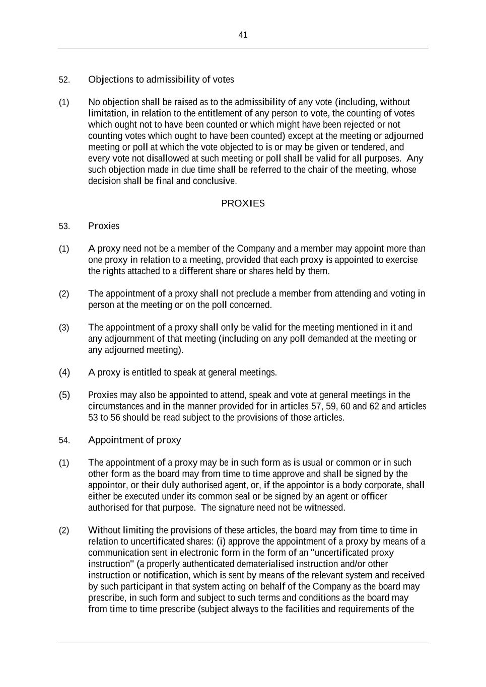 41 52. Objections to admissibility of votes (1) No objection shall be raised as to the admissibility of any vote (including, without limitation, in relation to the entitlement of any person to vote, the counting of votes which ought not to have been counted or which might have been rejected or not counting votes which ought to have been counted) except at the meeting or adjourned meeting or poll at which the vote objected to is or may be given or tendered, and every vote not disallowed at such meeting or poll shall be valid for all purposes. Any such objection made in due time shall be referred to the chair of the meeting, whose decision shall be final and conclusive. PROXIES 53. Proxies (1) A proxy need not be a member of the Company and a member may appoint more than one proxy in relation to a meeting, provided that each proxy is appointed to exercise the rights attached to a different share or shares held by them. (2) The appointment of a proxy shall not preclude a member from attending and voting in person at the meeting or on the poll concerned. (3) The appointment of a proxy shall only be valid for the meeting mentioned in it and any adjournment of that meeting (including on any poll demanded at the meeting or any adjourned meeting). (4) A proxy is entitled to speak at general meetings. (5) Proxies may also be appointed to attend, speak and vote at general meetings in the circumstances and in the manner provided for in articles 57, 59, 60 and 62 and articles 53 to 56 should be read subject to the provisions of those articles. 54. Appointment of proxy (1) The appointment of a proxy may be in such form as is usual or common or in such other form as the board may from time to time approve and shall be signed by the appointor, or their duly authorised agent, or, if the appointor is a body corporate, shall either be executed under its common seal or be signed by an agent or officer authorised for that purpose. The signature need not be witnessed. (2) Without limiting the provisions of these articles, the board may from time to time in relation to uncertificated shares: (i) approve the appointment of a proxy by means of a communication sent in electronic form in the form of an "uncertificated proxy instruction" (a properly authenticated dematerialised instruction and/or other instruction or notification, which is sent by means of the relevant system and received by such participant in that system acting on behalf of the Company as the board may prescribe, in such form and subject to such terms and conditions as the board may from time to time prescribe (subject always to the facilities and requirements of the