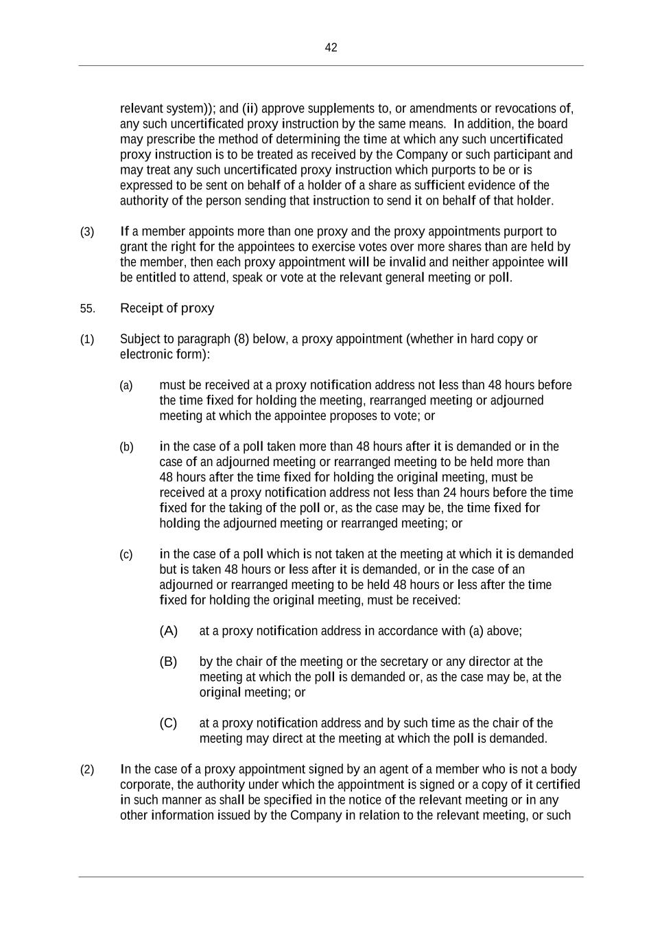 42 relevant system)); and (ii) approve supplements to, or amendments or revocations of, any such uncertificated proxy instruction by the same means. In addition, the board may prescribe the method of determining the time at which any such uncertificated proxy instruction is to be treated as received by the Company or such participant and may treat any such uncertificated proxy instruction which purports to be or is expressed to be sent on behalf of a holder of a share as sufficient evidence of the authority of the person sending that instruction to send it on behalf of that holder. (3) If a member appoints more than one proxy and the proxy appointments purport to grant the right for the appointees to exercise votes over more shares than are held by the member, then each proxy appointment will be invalid and neither appointee will be entitled to attend, speak or vote at the relevant general meeting or poll. 55. Receipt of proxy (1) Subject to paragraph (8) below, a proxy appointment (whether in hard copy or electronic form): (a) must be received at a proxy notification address not less than 48 hours before the time fixed for holding the meeting, rearranged meeting or adjourned meeting at which the appointee proposes to vote; or (b) in the case of a poll taken more than 48 hours after it is demanded or in the case of an adjourned meeting or rearranged meeting to be held more than 48 hours after the time fixed for holding the original meeting, must be received at a proxy notification address not less than 24 hours before the time fixed for the taking of the poll or, as the case may be, the time fixed for holding the adjourned meeting or rearranged meeting; or (c) in the case of a poll which is not taken at the meeting at which it is demanded but is taken 48 hours or less after it is demanded, or in the case of an adjourned or rearranged meeting to be held 48 hours or less after the time fixed for holding the original meeting, must be received: (A) at a proxy notification address in accordance with (a) above; (B) by the chair of the meeting or the secretary or any director at the meeting at which the poll is demanded or, as the case may be, at the original meeting; or (C) at a proxy notification address and by such time as the chair of the meeting may direct at the meeting at which the poll is demanded. (2) In the case of a proxy appointment signed by an agent of a member who is not a body corporate, the authority under which the appointment is signed or a copy of it certified in such manner as shall be specified in the notice of the relevant meeting or in any other information issued by the Company in relation to the relevant meeting, or such
