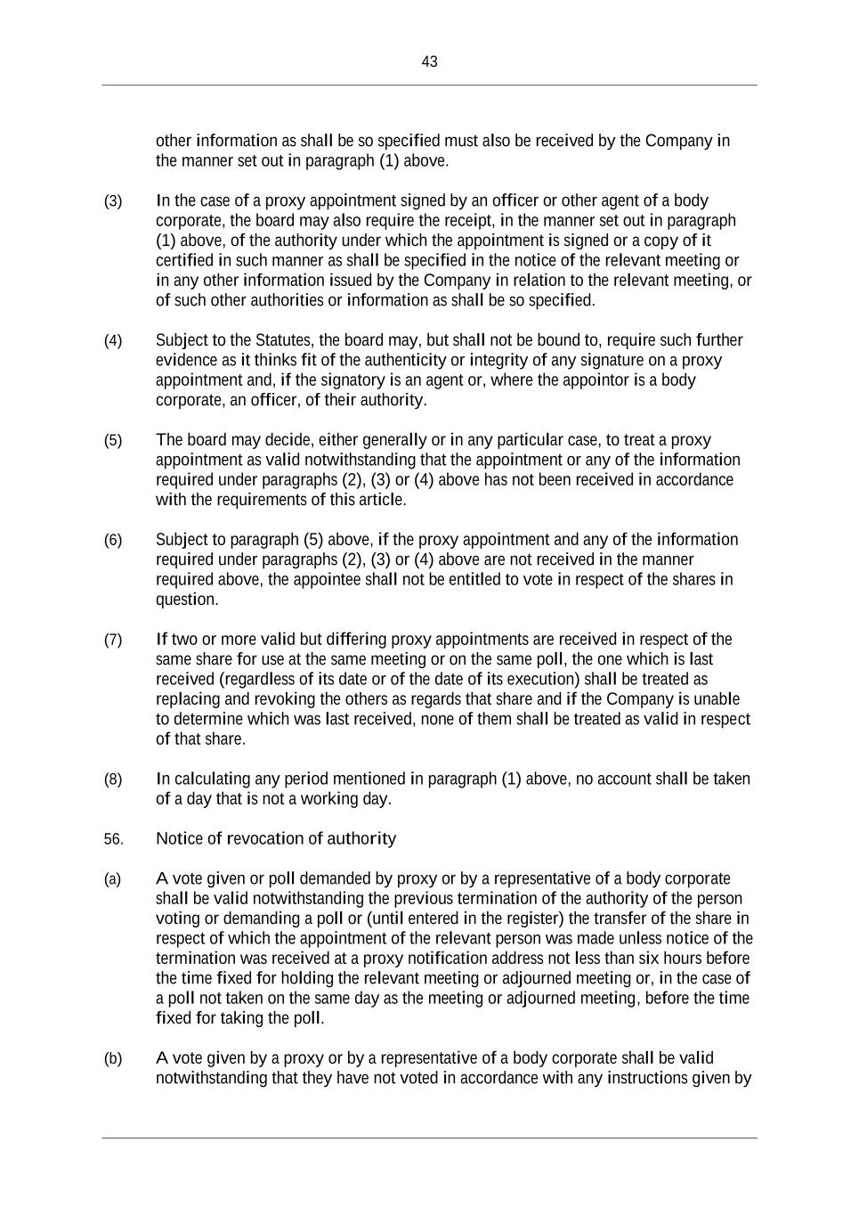 43 other information as shall be so specified must also be received by the Company in the manner set out in paragraph (1) above. (3) In the case of a proxy appointment signed by an officer or other agent of a body corporate, the board may also require the receipt, in the manner set out in paragraph (1) above, of the authority under which the appointment is signed or a copy of it certified in such manner as shall be specified in the notice of the relevant meeting or in any other information issued by the Company in relation to the relevant meeting, or of such other authorities or information as shall be so specified. (4) Subject to the Statutes, the board may, but shall not be bound to, require such further evidence as it thinks fit of the authenticity or integrity of any signature on a proxy appointment and, if the signatory is an agent or, where the appointor is a body corporate, an officer, of their authority. (5) The board may decide, either generally or in any particular case, to treat a proxy appointment as valid notwithstanding that the appointment or any of the information required under paragraphs (2), (3) or (4) above has not been received in accordance with the requirements of this article. (6) Subject to paragraph (5) above, if the proxy appointment and any of the information required under paragraphs (2), (3) or (4) above are not received in the manner required above, the appointee shall not be entitled to vote in respect of the shares in question. (7) If two or more valid but differing proxy appointments are received in respect of the same share for use at the same meeting or on the same poll, the one which is last received (regardless of its date or of the date of its execution) shall be treated as replacing and revoking the others as regards that share and if the Company is unable to determine which was last received, none of them shall be treated as valid in respect of that share. (8) In calculating any period mentioned in paragraph (1) above, no account shall be taken of a day that is not a working day. 56. Notice of revocation of authority (a) A vote given or poll demanded by proxy or by a representative of a body corporate shall be valid notwithstanding the previous termination of the authority of the person voting or demanding a poll or (until entered in the register) the transfer of the share in respect of which the appointment of the relevant person was made unless notice of the termination was received at a proxy notification address not less than six hours before the time fixed for holding the relevant meeting or adjourned meeting or, in the case of a poll not taken on the same day as the meeting or adjourned meeting, before the time fixed for taking the poll. (b) A vote given by a proxy or by a representative of a body corporate shall be valid notwithstanding that they have not voted in accordance with any instructions given by