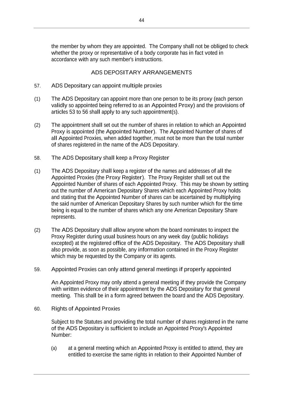 44 the member by whom they are appointed. The Company shall not be obliged to check whether the proxy or representative of a body corporate has in fact voted in accordance with any such member's instructions. ADS DEPOSITARY ARRANGEMENTS 57. ADS Depositary can appoint multiple proxies (1) The ADS Depositary can appoint more than one person to be its proxy (each person validly so appointed being referred to as an Appointed Proxy) and the provisions of articles 53 to 56 shall apply to any such appointment(s). (2) The appointment shall set out the number of shares in relation to which an Appointed Proxy is appointed (the Appointed Number). The Appointed Number of shares of all Appointed Proxies, when added together, must not be more than the total number of shares registered in the name of the ADS Depositary. 58. The ADS Depositary shall keep a Proxy Register (1) The ADS Depositary shall keep a register of the names and addresses of all the Appointed Proxies (the Proxy Register). The Proxy Register shall set out the Appointed Number of shares of each Appointed Proxy. This may be shown by setting out the number of American Depositary Shares which each Appointed Proxy holds and stating that the Appointed Number of shares can be ascertained by multiplying the said number of American Depositary Shares by such number which for the time being is equal to the number of shares which any one American Depositary Share represents. (2) The ADS Depositary shall allow anyone whom the board nominates to inspect the Proxy Register during usual business hours on any week day (public holidays excepted) at the registered office of the ADS Depositary. The ADS Depositary shall also provide, as soon as possible, any information contained in the Proxy Register which may be requested by the Company or its agents. 59. Appointed Proxies can only attend general meetings if properly appointed An Appointed Proxy may only attend a general meeting if they provide the Company with written evidence of their appointment by the ADS Depositary for that general meeting. This shall be in a form agreed between the board and the ADS Depositary. 60. Rights of Appointed Proxies Subject to the Statutes and providing the total number of shares registered in the name of the ADS Depositary is sufficient to include an Appointed Proxy's Appointed Number: (a) at a general meeting which an Appointed Proxy is entitled to attend, they are entitled to exercise the same rights in relation to their Appointed Number of