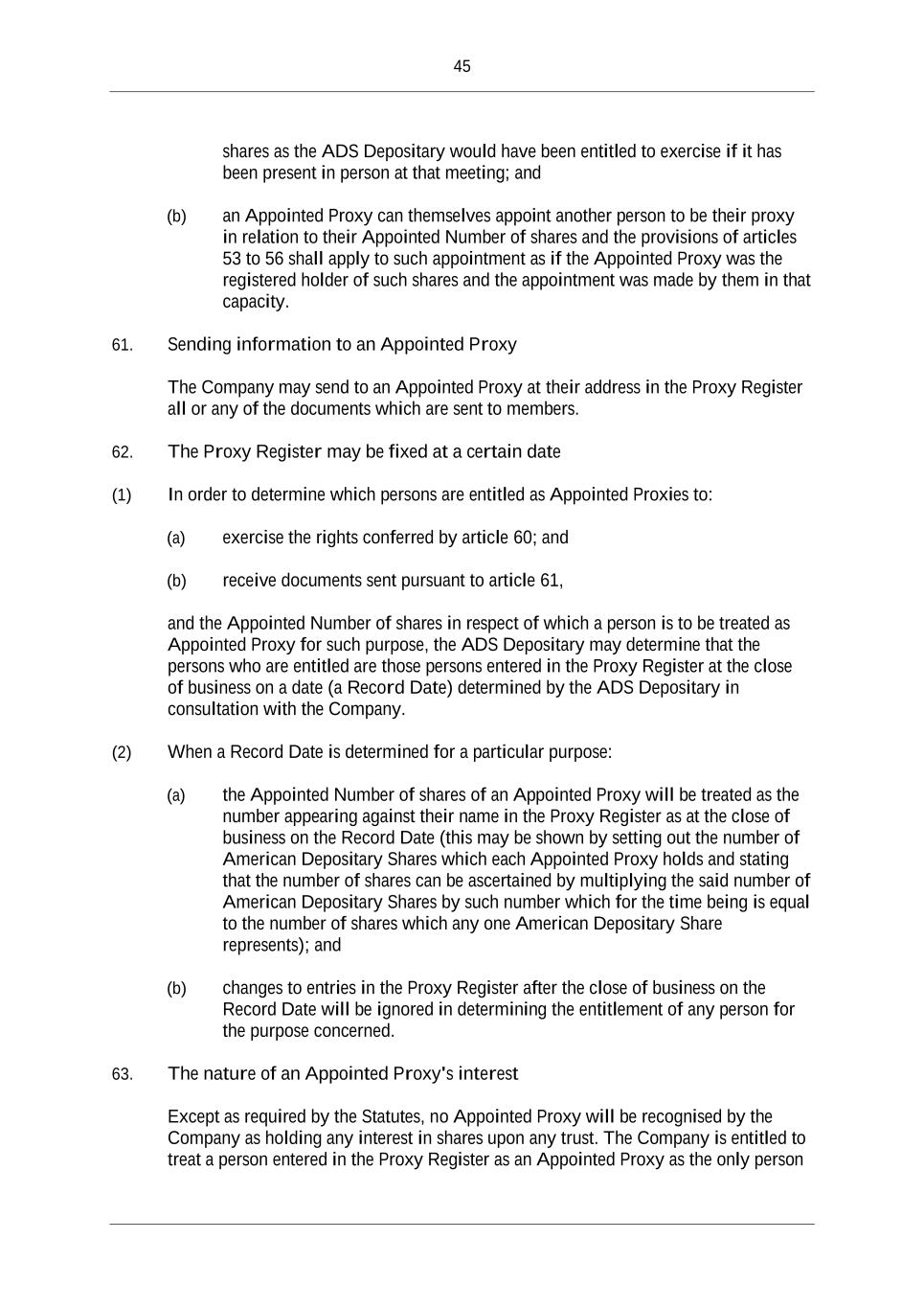 45 shares as the ADS Depositary would have been entitled to exercise if it has been present in person at that meeting; and (b) an Appointed Proxy can themselves appoint another person to be their proxy in relation to their Appointed Number of shares and the provisions of articles 53 to 56 shall apply to such appointment as if the Appointed Proxy was the registered holder of such shares and the appointment was made by them in that capacity. 61. Sending information to an Appointed Proxy The Company may send to an Appointed Proxy at their address in the Proxy Register all or any of the documents which are sent to members. 62. The Proxy Register may be fixed at a certain date (1) In order to determine which persons are entitled as Appointed Proxies to: (a) exercise the rights conferred by article 60; and (b) receive documents sent pursuant to article 61, and the Appointed Number of shares in respect of which a person is to be treated as Appointed Proxy for such purpose, the ADS Depositary may determine that the persons who are entitled are those persons entered in the Proxy Register at the close of business on a date (a Record Date) determined by the ADS Depositary in consultation with the Company. (2) When a Record Date is determined for a particular purpose: (a) the Appointed Number of shares of an Appointed Proxy will be treated as the number appearing against their name in the Proxy Register as at the close of business on the Record Date (this may be shown by setting out the number of American Depositary Shares which each Appointed Proxy holds and stating that the number of shares can be ascertained by multiplying the said number of American Depositary Shares by such number which for the time being is equal to the number of shares which any one American Depositary Share represents); and (b) changes to entries in the Proxy Register after the close of business on the Record Date will be ignored in determining the entitlement of any person for the purpose concerned. 63. The nature of an Appointed Proxy's interest Except as required by the Statutes, no Appointed Proxy will be recognised by the Company as holding any interest in shares upon any trust. The Company is entitled to treat a person entered in the Proxy Register as an Appointed Proxy as the only person