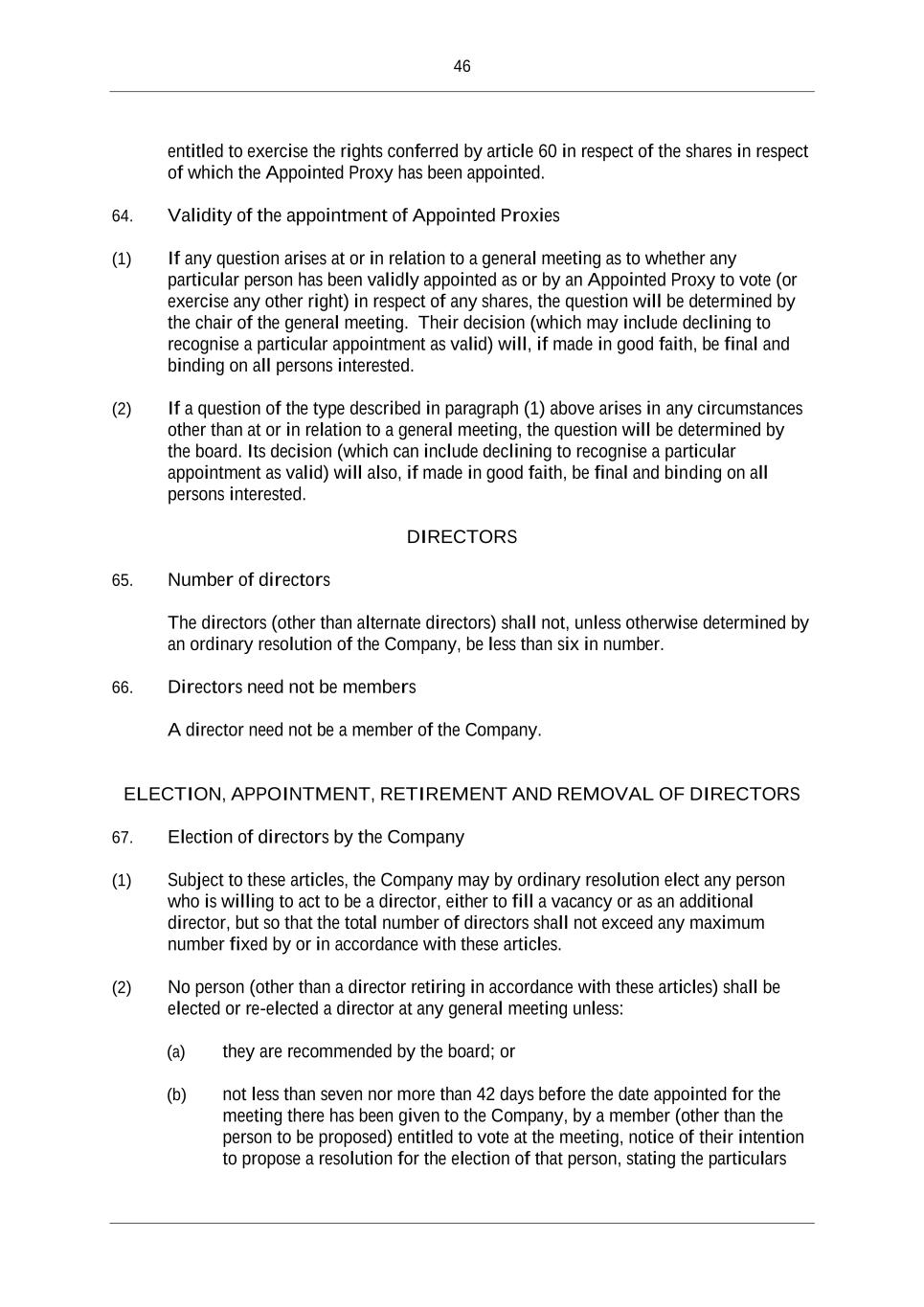 46 entitled to exercise the rights conferred by article 60 in respect of the shares in respect of which the Appointed Proxy has been appointed. 64. Validity of the appointment of Appointed Proxies (1) If any question arises at or in relation to a general meeting as to whether any particular person has been validly appointed as or by an Appointed Proxy to vote (or exercise any other right) in respect of any shares, the question will be determined by the chair of the general meeting. Their decision (which may include declining to recognise a particular appointment as valid) will, if made in good faith, be final and binding on all persons interested. (2) If a question of the type described in paragraph (1) above arises in any circumstances other than at or in relation to a general meeting, the question will be determined by the board. Its decision (which can include declining to recognise a particular appointment as valid) will also, if made in good faith, be final and binding on all persons interested. DIRECTORS 65. Number of directors The directors (other than alternate directors) shall not, unless otherwise determined by an ordinary resolution of the Company, be less than six in number. 66. Directors need not be members A director need not be a member of the Company. ELECTION, APPOINTMENT, RETIREMENT AND REMOVAL OF DIRECTORS 67. Election of directors by the Company (1) Subject to these articles, the Company may by ordinary resolution elect any person who is willing to act to be a director, either to fill a vacancy or as an additional director, but so that the total number of directors shall not exceed any maximum number fixed by or in accordance with these articles. (2) No person (other than a director retiring in accordance with these articles) shall be elected or re-elected a director at any general meeting unless: (a) they are recommended by the board; or (b) not less than seven nor more than 42 days before the date appointed for the meeting there has been given to the Company, by a member (other than the person to be proposed) entitled to vote at the meeting, notice of their intention to propose a resolution for the election of that person, stating the particulars