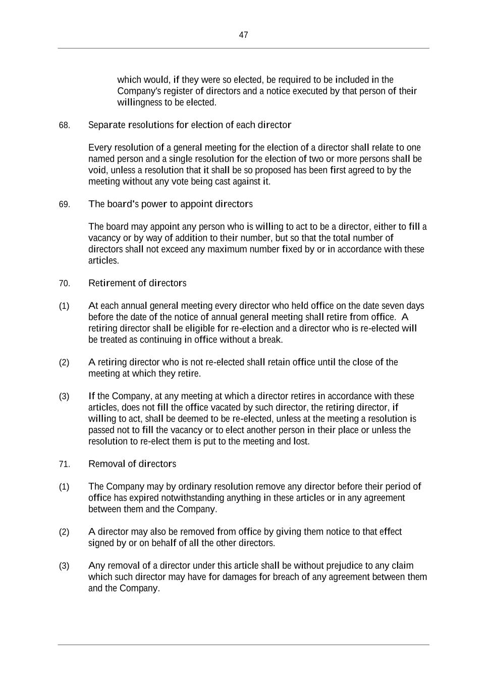 47 which would, if they were so elected, be required to be included in the Company's register of directors and a notice executed by that person of their willingness to be elected. 68. Separate resolutions for election of each director Every resolution of a general meeting for the election of a director shall relate to one named person and a single resolution for the election of two or more persons shall be void, unless a resolution that it shall be so proposed has been first agreed to by the meeting without any vote being cast against it. 69. The board's power to appoint directors The board may appoint any person who is willing to act to be a director, either to fill a vacancy or by way of addition to their number, but so that the total number of directors shall not exceed any maximum number fixed by or in accordance with these articles. 70. Retirement of directors (1) At each annual general meeting every director who held office on the date seven days before the date of the notice of annual general meeting shall retire from office. A retiring director shall be eligible for re-election and a director who is re-elected will be treated as continuing in office without a break. (2) A retiring director who is not re-elected shall retain office until the close of the meeting at which they retire. (3) If the Company, at any meeting at which a director retires in accordance with these articles, does not fill the office vacated by such director, the retiring director, if willing to act, shall be deemed to be re-elected, unless at the meeting a resolution is passed not to fill the vacancy or to elect another person in their place or unless the resolution to re-elect them is put to the meeting and lost. 71. Removal of directors (1) The Company may by ordinary resolution remove any director before their period of office has expired notwithstanding anything in these articles or in any agreement between them and the Company. (2) A director may also be removed from office by giving them notice to that effect signed by or on behalf of all the other directors. (3) Any removal of a director under this article shall be without prejudice to any claim which such director may have for damages for breach of any agreement between them and the Company.