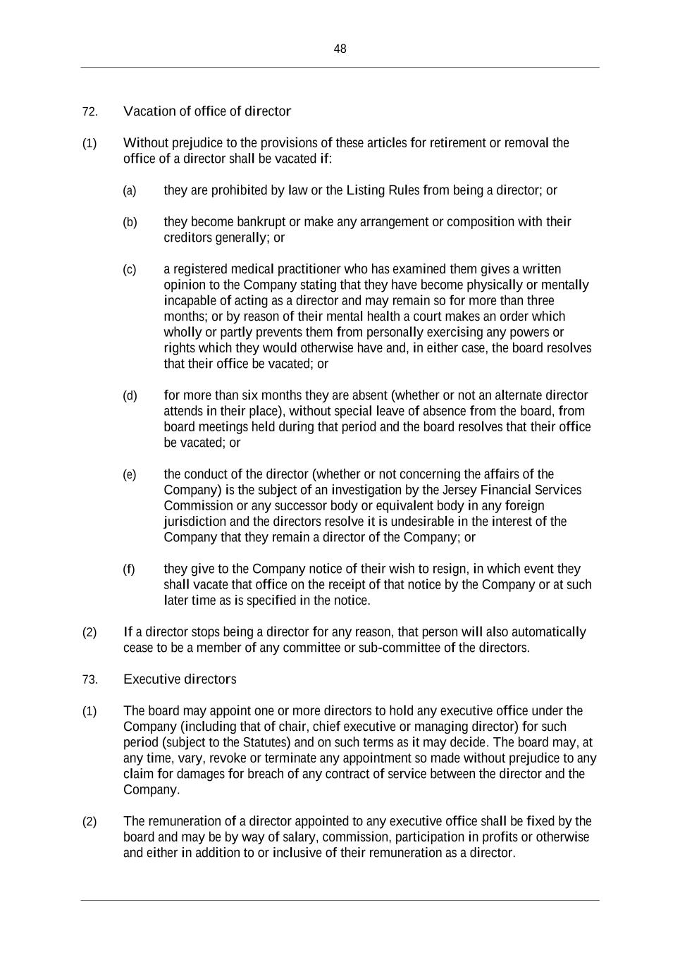 48 72. Vacation of office of director (1) Without prejudice to the provisions of these articles for retirement or removal the office of a director shall be vacated if: (a) they are prohibited by law or the Listing Rules from being a director; or (b) they become bankrupt or make any arrangement or composition with their creditors generally; or (c) a registered medical practitioner who has examined them gives a written opinion to the Company stating that they have become physically or mentally incapable of acting as a director and may remain so for more than three months; or by reason of their mental health a court makes an order which wholly or partly prevents them from personally exercising any powers or rights which they would otherwise have and, in either case, the board resolves that their office be vacated; or (d) for more than six months they are absent (whether or not an alternate director attends in their place), without special leave of absence from the board, from board meetings held during that period and the board resolves that their office be vacated; or (e) the conduct of the director (whether or not concerning the affairs of the Company) is the subject of an investigation by the Jersey Financial Services Commission or any successor body or equivalent body in any foreign jurisdiction and the directors resolve it is undesirable in the interest of the Company that they remain a director of the Company; or (f) they give to the Company notice of their wish to resign, in which event they shall vacate that office on the receipt of that notice by the Company or at such later time as is specified in the notice. (2) If a director stops being a director for any reason, that person will also automatically cease to be a member of any committee or sub-committee of the directors. 73. Executive directors (1) The board may appoint one or more directors to hold any executive office under the Company (including that of chair, chief executive or managing director) for such period (subject to the Statutes) and on such terms as it may decide. The board may, at any time, vary, revoke or terminate any appointment so made without prejudice to any claim for damages for breach of any contract of service between the director and the Company. (2) The remuneration of a director appointed to any executive office shall be fixed by the board and may be by way of salary, commission, participation in profits or otherwise and either in addition to or inclusive of their remuneration as a director.