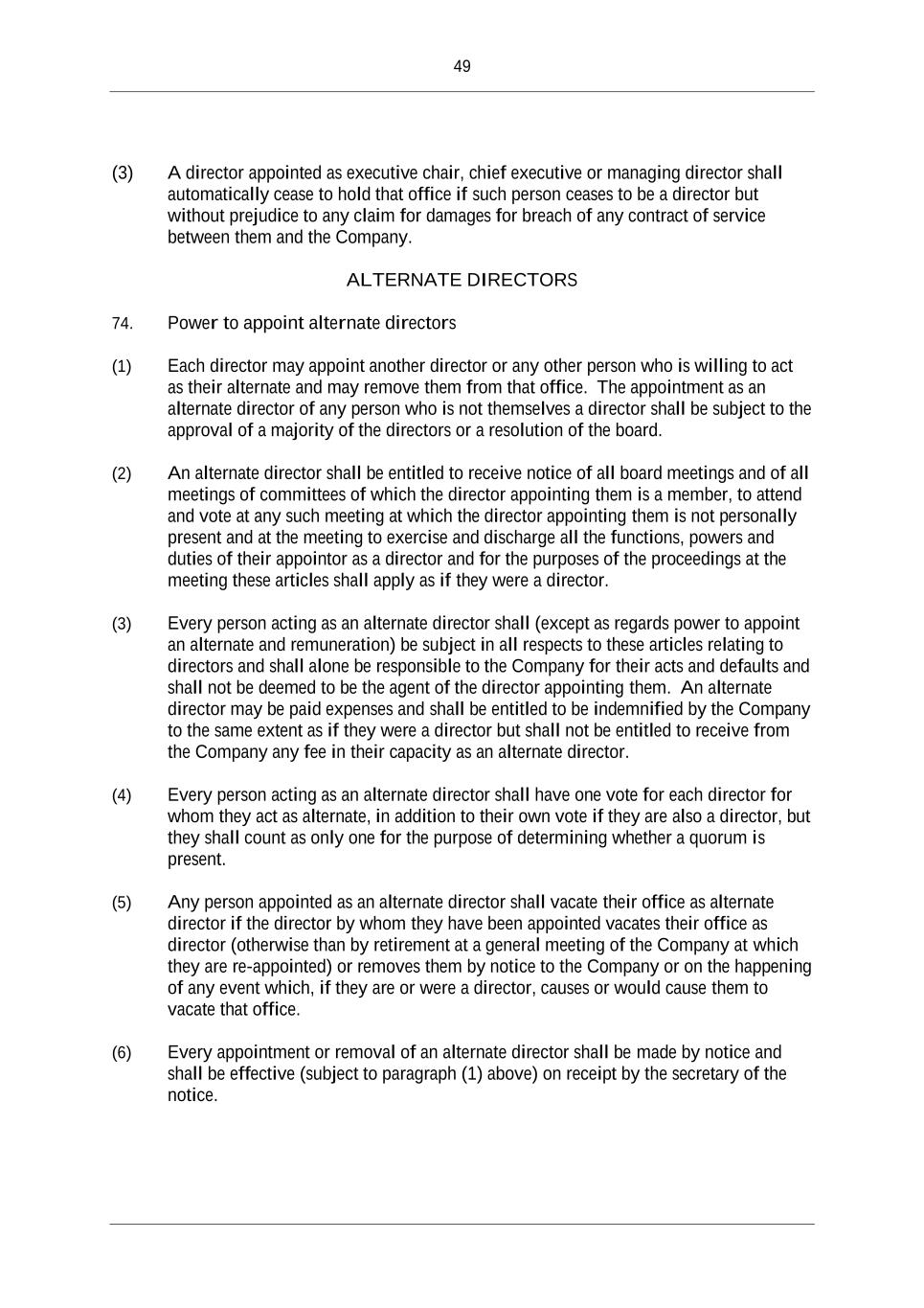 49 (3) A director appointed as executive chair, chief executive or managing director shall automatically cease to hold that office if such person ceases to be a director but without prejudice to any claim for damages for breach of any contract of service between them and the Company. ALTERNATE DIRECTORS 74. Power to appoint alternate directors (1) Each director may appoint another director or any other person who is willing to act as their alternate and may remove them from that office. The appointment as an alternate director of any person who is not themselves a director shall be subject to the approval of a majority of the directors or a resolution of the board. (2) An alternate director shall be entitled to receive notice of all board meetings and of all meetings of committees of which the director appointing them is a member, to attend and vote at any such meeting at which the director appointing them is not personally present and at the meeting to exercise and discharge all the functions, powers and duties of their appointor as a director and for the purposes of the proceedings at the meeting these articles shall apply as if they were a director. (3) Every person acting as an alternate director shall (except as regards power to appoint an alternate and remuneration) be subject in all respects to these articles relating to directors and shall alone be responsible to the Company for their acts and defaults and shall not be deemed to be the agent of the director appointing them. An alternate director may be paid expenses and shall be entitled to be indemnified by the Company to the same extent as if they were a director but shall not be entitled to receive from the Company any fee in their capacity as an alternate director. (4) Every person acting as an alternate director shall have one vote for each director for whom they act as alternate, in addition to their own vote if they are also a director, but they shall count as only one for the purpose of determining whether a quorum is present. (5) Any person appointed as an alternate director shall vacate their office as alternate director if the director by whom they have been appointed vacates their office as director (otherwise than by retirement at a general meeting of the Company at which they are re-appointed) or removes them by notice to the Company or on the happening of any event which, if they are or were a director, causes or would cause them to vacate that office. (6) Every appointment or removal of an alternate director shall be made by notice and shall be effective (subject to paragraph (1) above) on receipt by the secretary of the notice.