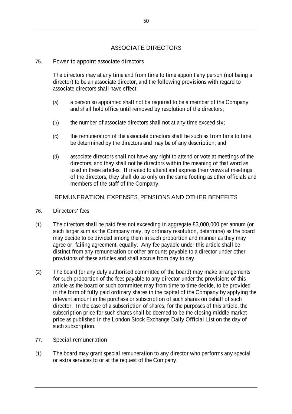 50 ASSOCIATE DIRECTORS 75. Power to appoint associate directors The directors may at any time and from time to time appoint any person (not being a director) to be an associate director, and the following provisions with regard to associate directors shall have effect: (a) a person so appointed shall not be required to be a member of the Company and shall hold office until removed by resolution of the directors; (b) the number of associate directors shall not at any time exceed six; (c) the remuneration of the associate directors shall be such as from time to time be determined by the directors and may be of any description; and (d) associate directors shall not have any right to attend or vote at meetings of the directors, and they shall not be directors within the meaning of that word as used in these articles. If invited to attend and express their views at meetings of the directors, they shall do so only on the same footing as other officials and members of the staff of the Company. REMUNERATION, EXPENSES, PENSIONS AND OTHER BENEFITS 76. Directors' fees (1) The directors shall be paid fees not exceeding in aggregate £3,000,000 per annum (or such larger sum as the Company may, by ordinary resolution, determine) as the board may decide to be divided among them in such proportion and manner as they may agree or, failing agreement, equally. Any fee payable under this article shall be distinct from any remuneration or other amounts payable to a director under other provisions of these articles and shall accrue from day to day. (2) The board (or any duly authorised committee of the board) may make arrangements for such proportion of the fees payable to any director under the provisions of this article as the board or such committee may from time to time decide, to be provided in the form of fully paid ordinary shares in the capital of the Company by applying the relevant amount in the purchase or subscription of such shares on behalf of such director. In the case of a subscription of shares, for the purposes of this article, the subscription price for such shares shall be deemed to be the closing middle market price as published in the London Stock Exchange Daily Official List on the day of such subscription. 77. Special remuneration (1) The board may grant special remuneration to any director who performs any special or extra services to or at the request of the Company.