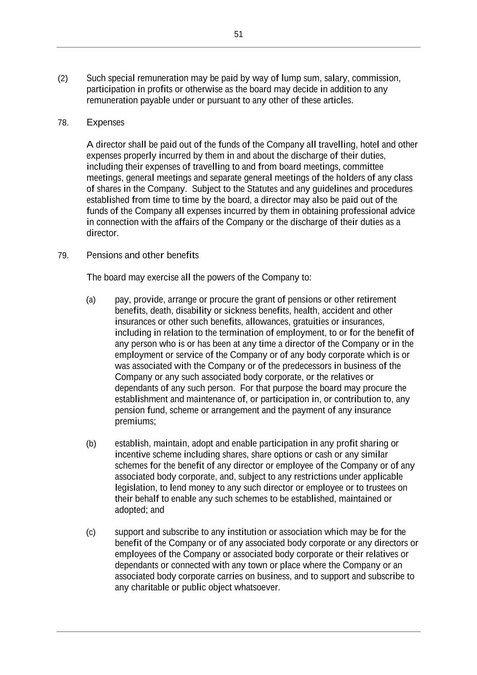 51 (2) Such special remuneration may be paid by way of lump sum, salary, commission, participation in profits or otherwise as the board may decide in addition to any remuneration payable under or pursuant to any other of these articles. 78. Expenses A director shall be paid out of the funds of the Company all travelling, hotel and other expenses properly incurred by them in and about the discharge of their duties, including their expenses of travelling to and from board meetings, committee meetings, general meetings and separate general meetings of the holders of any class of shares in the Company. Subject to the Statutes and any guidelines and procedures established from time to time by the board, a director may also be paid out of the funds of the Company all expenses incurred by them in obtaining professional advice in connection with the affairs of the Company or the discharge of their duties as a director. 79. Pensions and other benefits The board may exercise all the powers of the Company to: (a) pay, provide, arrange or procure the grant of pensions or other retirement benefits, death, disability or sickness benefits, health, accident and other insurances or other such benefits, allowances, gratuities or insurances, including in relation to the termination of employment, to or for the benefit of any person who is or has been at any time a director of the Company or in the employment or service of the Company or of any body corporate which is or was associated with the Company or of the predecessors in business of the Company or any such associated body corporate, or the relatives or dependants of any such person. For that purpose the board may procure the establishment and maintenance of, or participation in, or contribution to, any pension fund, scheme or arrangement and the payment of any insurance premiums; (b) establish, maintain, adopt and enable participation in any profit sharing or incentive scheme including shares, share options or cash or any similar schemes for the benefit of any director or employee of the Company or of any associated body corporate, and, subject to any restrictions under applicable legislation, to lend money to any such director or employee or to trustees on their behalf to enable any such schemes to be established, maintained or adopted; and (c) support and subscribe to any institution or association which may be for the benefit of the Company or of any associated body corporate or any directors or employees of the Company or associated body corporate or their relatives or dependants or connected with any town or place where the Company or an associated body corporate carries on business, and to support and subscribe to any charitable or public object whatsoever.