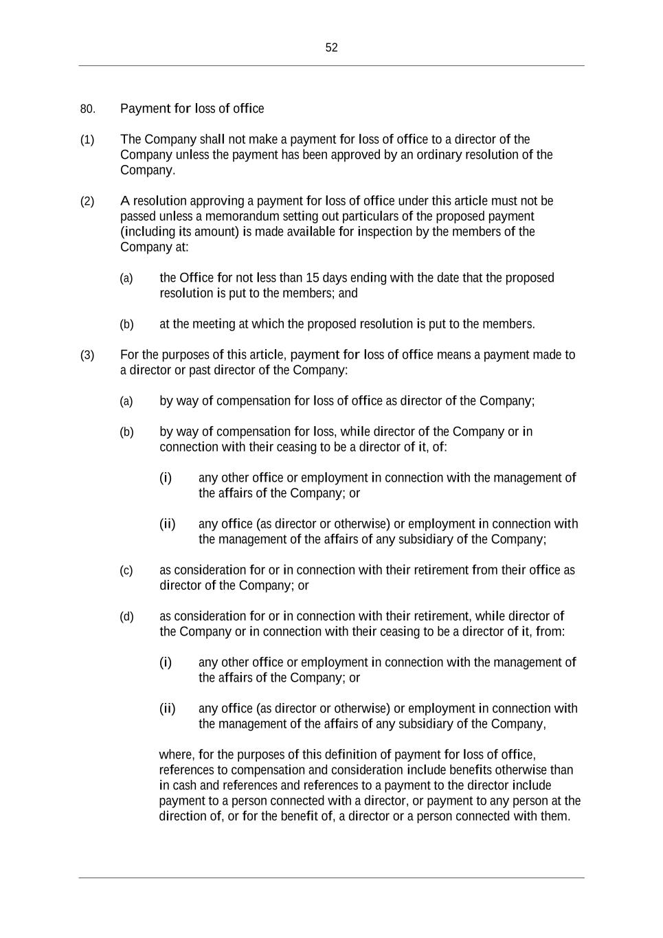 52 80. Payment for loss of office (1) The Company shall not make a payment for loss of office to a director of the Company unless the payment has been approved by an ordinary resolution of the Company. (2) A resolution approving a payment for loss of office under this article must not be passed unless a memorandum setting out particulars of the proposed payment (including its amount) is made available for inspection by the members of the Company at: (a) the Office for not less than 15 days ending with the date that the proposed resolution is put to the members; and (b) at the meeting at which the proposed resolution is put to the members. (3) For the purposes of this article, payment for loss of office means a payment made to a director or past director of the Company: (a) by way of compensation for loss of office as director of the Company; (b) by way of compensation for loss, while director of the Company or in connection with their ceasing to be a director of it, of: (i) any other office or employment in connection with the management of the affairs of the Company; or (ii) any office (as director or otherwise) or employment in connection with the management of the affairs of any subsidiary of the Company; (c) as consideration for or in connection with their retirement from their office as director of the Company; or (d) as consideration for or in connection with their retirement, while director of the Company or in connection with their ceasing to be a director of it, from: (i) any other office or employment in connection with the management of the affairs of the Company; or (ii) any office (as director or otherwise) or employment in connection with the management of the affairs of any subsidiary of the Company, where, for the purposes of this definition of payment for loss of office, references to compensation and consideration include benefits otherwise than in cash and references and references to a payment to the director include payment to a person connected with a director, or payment to any person at the direction of, or for the benefit of, a director or a person connected with them.