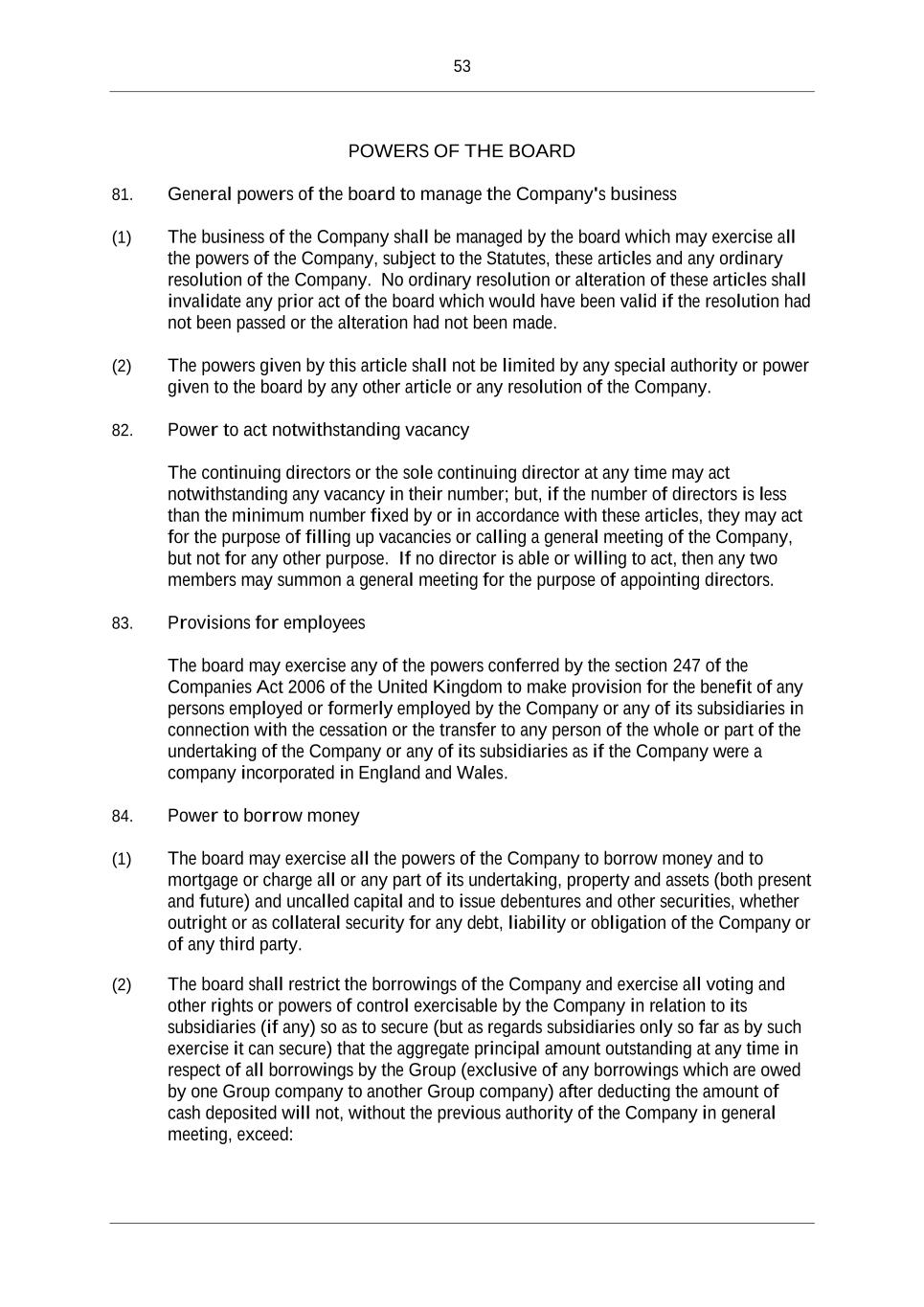 53 POWERS OF THE BOARD 81. General powers of the board to manage the Company's business (1) The business of the Company shall be managed by the board which may exercise all the powers of the Company, subject to the Statutes, these articles and any ordinary resolution of the Company. No ordinary resolution or alteration of these articles shall invalidate any prior act of the board which would have been valid if the resolution had not been passed or the alteration had not been made. (2) The powers given by this article shall not be limited by any special authority or power given to the board by any other article or any resolution of the Company. 82. Power to act notwithstanding vacancy The continuing directors or the sole continuing director at any time may act notwithstanding any vacancy in their number; but, if the number of directors is less than the minimum number fixed by or in accordance with these articles, they may act for the purpose of filling up vacancies or calling a general meeting of the Company, but not for any other purpose. If no director is able or willing to act, then any two members may summon a general meeting for the purpose of appointing directors. 83. Provisions for employees The board may exercise any of the powers conferred by the section 247 of the Companies Act 2006 of the United Kingdom to make provision for the benefit of any persons employed or formerly employed by the Company or any of its subsidiaries in connection with the cessation or the transfer to any person of the whole or part of the undertaking of the Company or any of its subsidiaries as if the Company were a company incorporated in England and Wales. 84. Power to borrow money (1) The board may exercise all the powers of the Company to borrow money and to mortgage or charge all or any part of its undertaking, property and assets (both present and future) and uncalled capital and to issue debentures and other securities, whether outright or as collateral security for any debt, liability or obligation of the Company or of any third party. (2) The board shall restrict the borrowings of the Company and exercise all voting and other rights or powers of control exercisable by the Company in relation to its subsidiaries (if any) so as to secure (but as regards subsidiaries only so far as by such exercise it can secure) that the aggregate principal amount outstanding at any time in respect of all borrowings by the Group (exclusive of any borrowings which are owed by one Group company to another Group company) after deducting the amount of cash deposited will not, without the previous authority of the Company in general meeting, exceed: