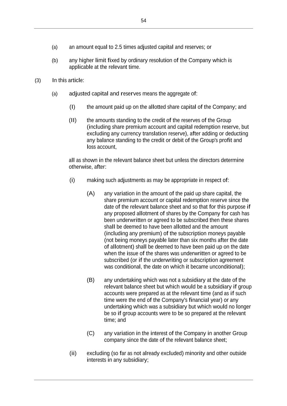 54 (a) an amount equal to 2.5 times adjusted capital and reserves; or (b) any higher limit fixed by ordinary resolution of the Company which is applicable at the relevant time. (3) In this article: (a) adjusted capital and reserves means the aggregate of: (I) the amount paid up on the allotted share capital of the Company; and (II) the amounts standing to the credit of the reserves of the Group (including share premium account and capital redemption reserve, but excluding any currency translation reserve), after adding or deducting any balance standing to the credit or debit of the Group's profit and loss account, all as shown in the relevant balance sheet but unless the directors determine otherwise, after: (i) making such adjustments as may be appropriate in respect of: (A) any variation in the amount of the paid up share capital, the share premium account or capital redemption reserve since the date of the relevant balance sheet and so that for this purpose if any proposed allotment of shares by the Company for cash has been underwritten or agreed to be subscribed then these shares shall be deemed to have been allotted and the amount (including any premium) of the subscription moneys payable (not being moneys payable later than six months after the date of allotment) shall be deemed to have been paid up on the date when the issue of the shares was underwritten or agreed to be subscribed (or if the underwriting or subscription agreement was conditional, the date on which it became unconditional); (B) any undertaking which was not a subsidiary at the date of the relevant balance sheet but which would be a subsidiary if group accounts were prepared as at the relevant time (and as if such time were the end of the Company's financial year) or any undertaking which was a subsidiary but which would no longer be so if group accounts were to be so prepared at the relevant time; and (C) any variation in the interest of the Company in another Group company since the date of the relevant balance sheet; (ii) excluding (so far as not already excluded) minority and other outside interests in any subsidiary;