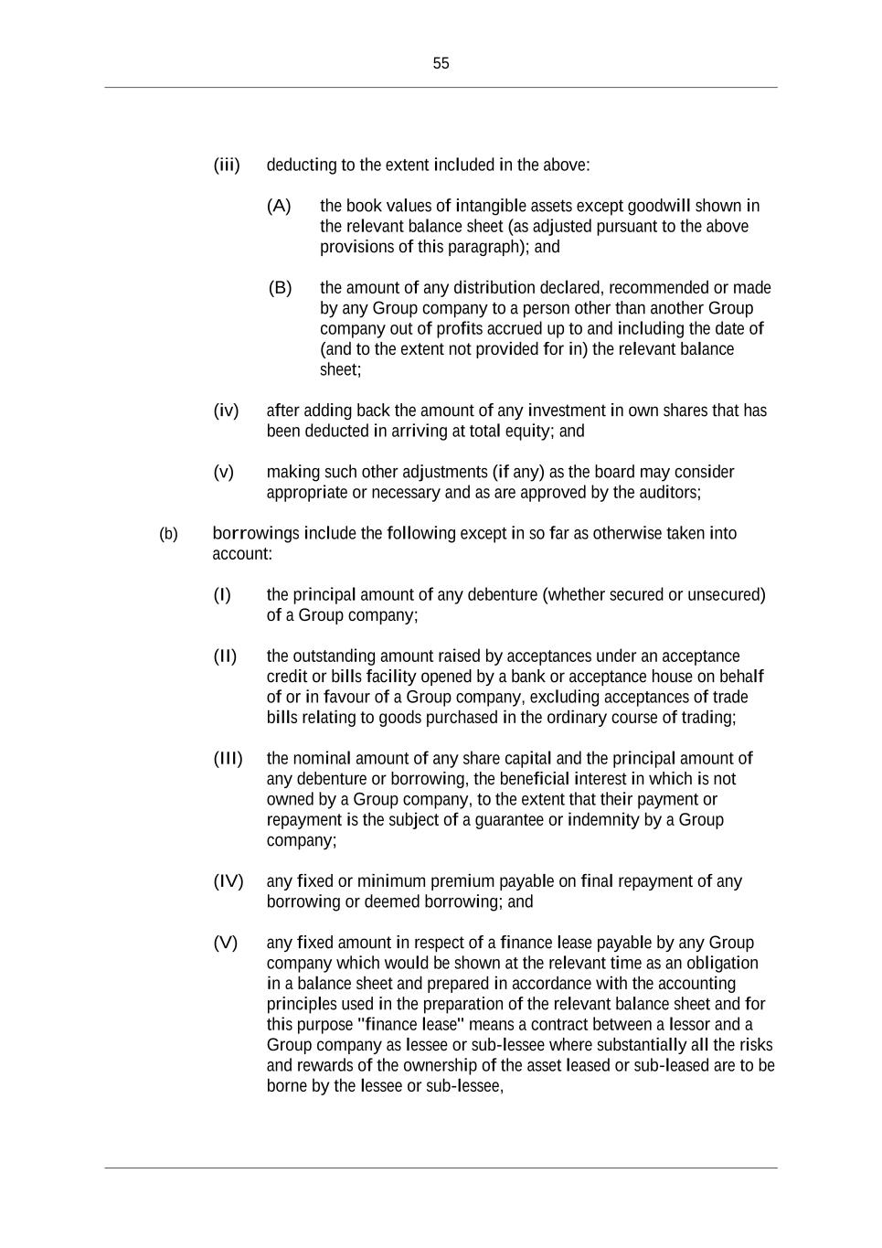 55 (iii) deducting to the extent included in the above: (A) the book values of intangible assets except goodwill shown in the relevant balance sheet (as adjusted pursuant to the above provisions of this paragraph); and (B) the amount of any distribution declared, recommended or made by any Group company to a person other than another Group company out of profits accrued up to and including the date of (and to the extent not provided for in) the relevant balance sheet; (iv) after adding back the amount of any investment in own shares that has been deducted in arriving at total equity; and (v) making such other adjustments (if any) as the board may consider appropriate or necessary and as are approved by the auditors; (b) borrowings include the following except in so far as otherwise taken into account: (I) the principal amount of any debenture (whether secured or unsecured) of a Group company; (II) the outstanding amount raised by acceptances under an acceptance credit or bills facility opened by a bank or acceptance house on behalf of or in favour of a Group company, excluding acceptances of trade bills relating to goods purchased in the ordinary course of trading; (III) the nominal amount of any share capital and the principal amount of any debenture or borrowing, the beneficial interest in which is not owned by a Group company, to the extent that their payment or repayment is the subject of a guarantee or indemnity by a Group company; (IV) any fixed or minimum premium payable on final repayment of any borrowing or deemed borrowing; and (V) any fixed amount in respect of a finance lease payable by any Group company which would be shown at the relevant time as an obligation in a balance sheet and prepared in accordance with the accounting principles used in the preparation of the relevant balance sheet and for this purpose "finance lease" means a contract between a lessor and a Group company as lessee or sub-lessee where substantially all the risks and rewards of the ownership of the asset leased or sub-leased are to be borne by the lessee or sub-lessee,