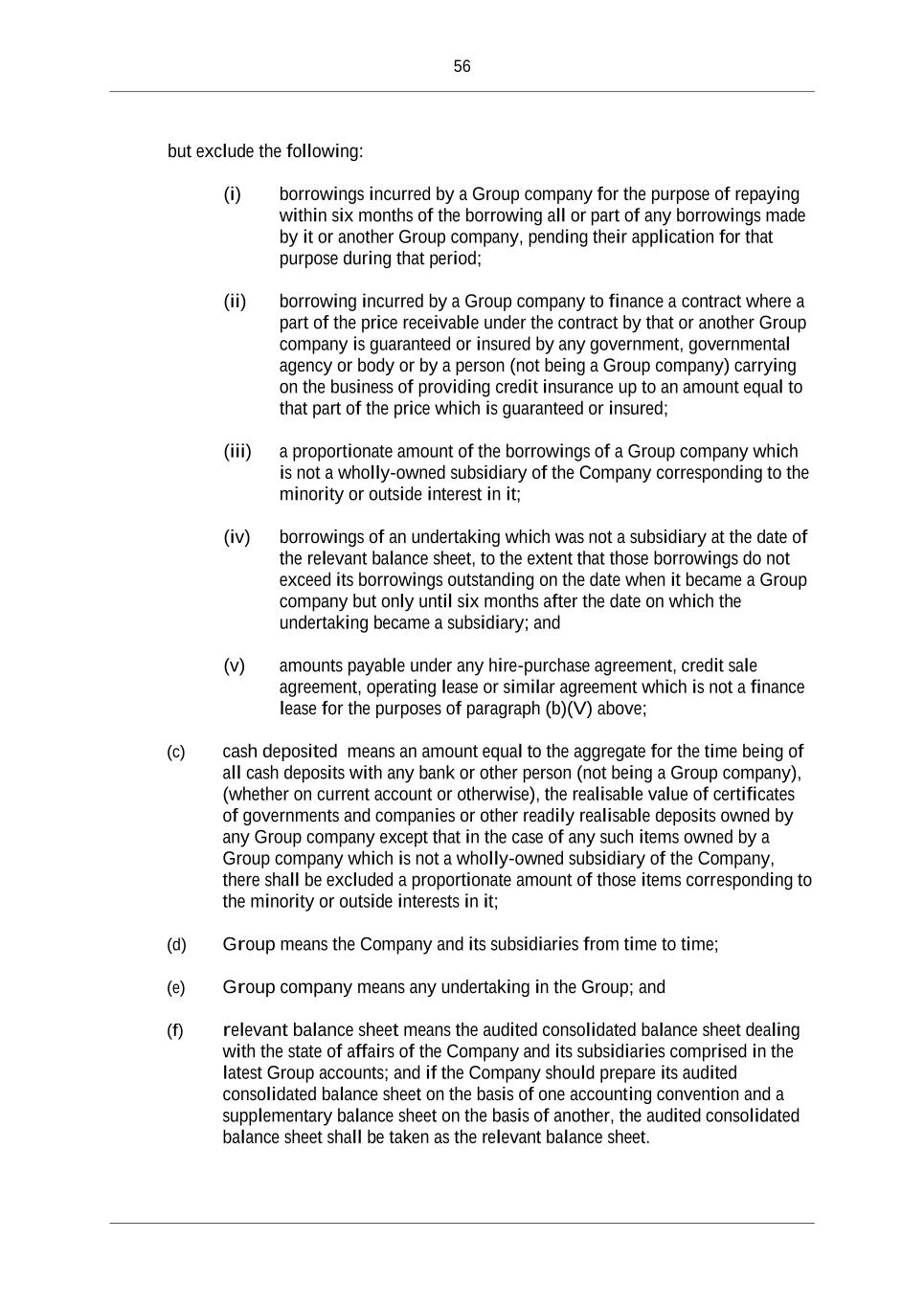 56 but exclude the following: (i) borrowings incurred by a Group company for the purpose of repaying within six months of the borrowing all or part of any borrowings made by it or another Group company, pending their application for that purpose during that period; (ii) borrowing incurred by a Group company to finance a contract where a part of the price receivable under the contract by that or another Group company is guaranteed or insured by any government, governmental agency or body or by a person (not being a Group company) carrying on the business of providing credit insurance up to an amount equal to that part of the price which is guaranteed or insured; (iii) a proportionate amount of the borrowings of a Group company which is not a wholly-owned subsidiary of the Company corresponding to the minority or outside interest in it; (iv) borrowings of an undertaking which was not a subsidiary at the date of the relevant balance sheet, to the extent that those borrowings do not exceed its borrowings outstanding on the date when it became a Group company but only until six months after the date on which the undertaking became a subsidiary; and (v) amounts payable under any hire-purchase agreement, credit sale agreement, operating lease or similar agreement which is not a finance lease for the purposes of paragraph (b)(V) above; (c) cash deposited means an amount equal to the aggregate for the time being of all cash deposits with any bank or other person (not being a Group company), (whether on current account or otherwise), the realisable value of certificates of governments and companies or other readily realisable deposits owned by any Group company except that in the case of any such items owned by a Group company which is not a wholly-owned subsidiary of the Company, there shall be excluded a proportionate amount of those items corresponding to the minority or outside interests in it; (d) Group means the Company and its subsidiaries from time to time; (e) Group company means any undertaking in the Group; and (f) relevant balance sheet means the audited consolidated balance sheet dealing with the state of affairs of the Company and its subsidiaries comprised in the latest Group accounts; and if the Company should prepare its audited consolidated balance sheet on the basis of one accounting convention and a supplementary balance sheet on the basis of another, the audited consolidated balance sheet shall be taken as the relevant balance sheet.