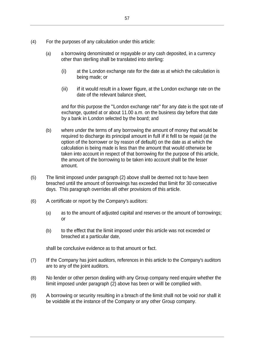 57 (4) For the purposes of any calculation under this article: (a) a borrowing denominated or repayable or any cash deposited, in a currency other than sterling shall be translated into sterling: (i) at the London exchange rate for the date as at which the calculation is being made; or (ii) if it would result in a lower figure, at the London exchange rate on the date of the relevant balance sheet, and for this purpose the "London exchange rate" for any date is the spot rate of exchange, quoted at or about 11.00 a.m. on the business day before that date by a bank in London selected by the board; and (b) where under the terms of any borrowing the amount of money that would be required to discharge its principal amount in full if it fell to be repaid (at the option of the borrower or by reason of default) on the date as at which the calculation is being made is less than the amount that would otherwise be taken into account in respect of that borrowing for the purpose of this article, the amount of the borrowing to be taken into account shall be the lesser amount. (5) The limit imposed under paragraph (2) above shall be deemed not to have been breached until the amount of borrowings has exceeded that limit for 30 consecutive days. This paragraph overrides all other provisions of this article. (6) A certificate or report by the Company's auditors: (a) as to the amount of adjusted capital and reserves or the amount of borrowings; or (b) to the effect that the limit imposed under this article was not exceeded or breached at a particular date, shall be conclusive evidence as to that amount or fact. (7) If the Company has joint auditors, references in this article to the Company's auditors are to any of the joint auditors. (8) No lender or other person dealing with any Group company need enquire whether the limit imposed under paragraph (2) above has been or will be complied with. (9) A borrowing or security resulting in a breach of the limit shall not be void nor shall it be voidable at the instance of the Company or any other Group company.