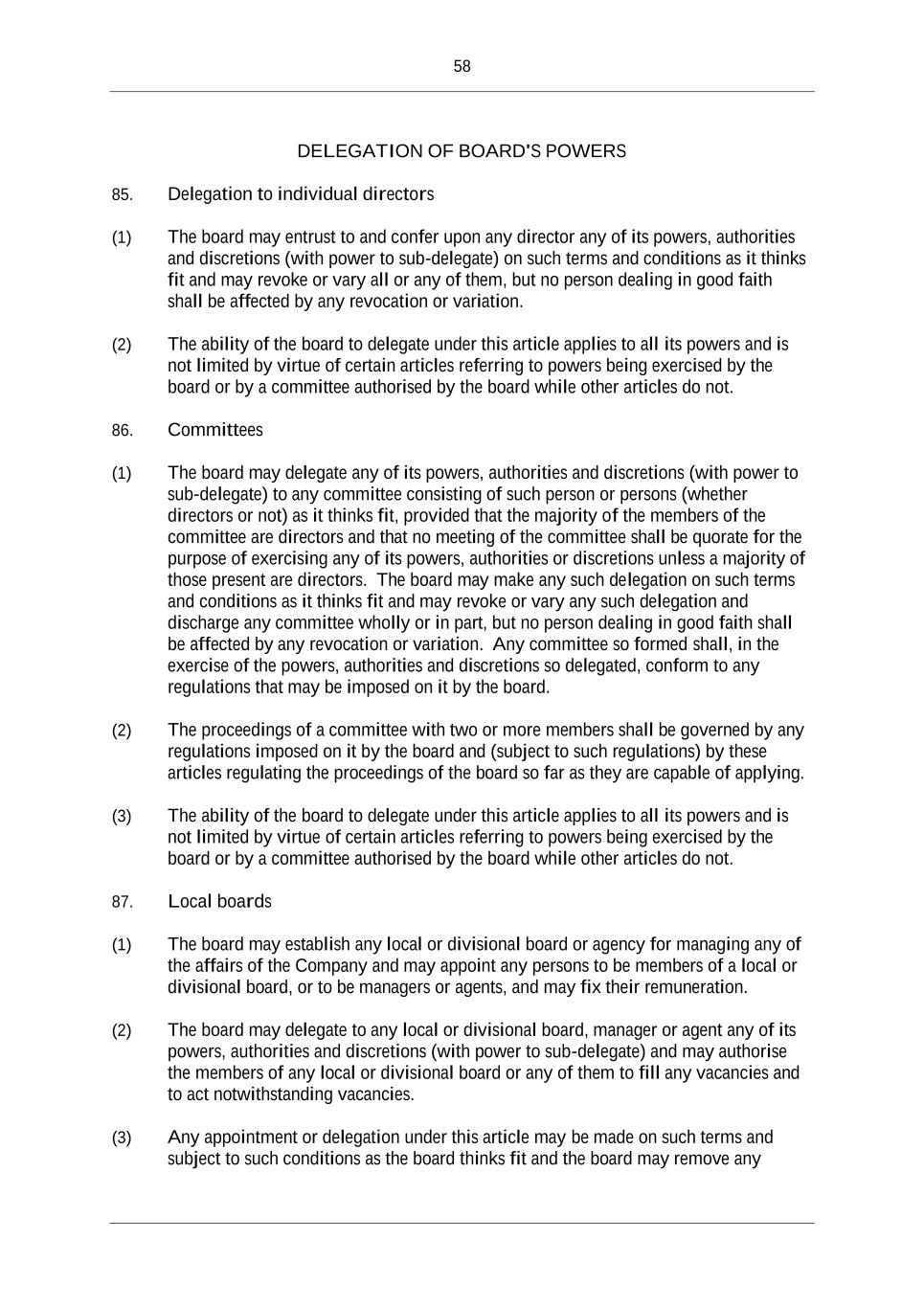 58 DELEGATION OF BOARD'S POWERS 85. Delegation to individual directors (1) The board may entrust to and confer upon any director any of its powers, authorities and discretions (with power to sub-delegate) on such terms and conditions as it thinks fit and may revoke or vary all or any of them, but no person dealing in good faith shall be affected by any revocation or variation. (2) The ability of the board to delegate under this article applies to all its powers and is not limited by virtue of certain articles referring to powers being exercised by the board or by a committee authorised by the board while other articles do not. 86. Committees (1) The board may delegate any of its powers, authorities and discretions (with power to sub-delegate) to any committee consisting of such person or persons (whether directors or not) as it thinks fit, provided that the majority of the members of the committee are directors and that no meeting of the committee shall be quorate for the purpose of exercising any of its powers, authorities or discretions unless a majority of those present are directors. The board may make any such delegation on such terms and conditions as it thinks fit and may revoke or vary any such delegation and discharge any committee wholly or in part, but no person dealing in good faith shall be affected by any revocation or variation. Any committee so formed shall, in the exercise of the powers, authorities and discretions so delegated, conform to any regulations that may be imposed on it by the board. (2) The proceedings of a committee with two or more members shall be governed by any regulations imposed on it by the board and (subject to such regulations) by these articles regulating the proceedings of the board so far as they are capable of applying. (3) The ability of the board to delegate under this article applies to all its powers and is not limited by virtue of certain articles referring to powers being exercised by the board or by a committee authorised by the board while other articles do not. 87. Local boards (1) The board may establish any local or divisional board or agency for managing any of the affairs of the Company and may appoint any persons to be members of a local or divisional board, or to be managers or agents, and may fix their remuneration. (2) The board may delegate to any local or divisional board, manager or agent any of its powers, authorities and discretions (with power to sub-delegate) and may authorise the members of any local or divisional board or any of them to fill any vacancies and to act notwithstanding vacancies. (3) Any appointment or delegation under this article may be made on such terms and subject to such conditions as the board thinks fit and the board may remove any