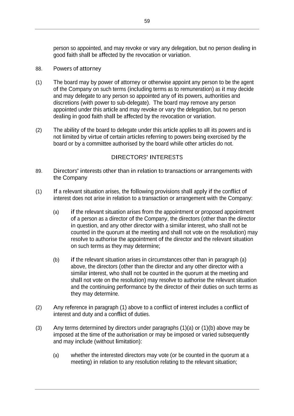 59 person so appointed, and may revoke or vary any delegation, but no person dealing in good faith shall be affected by the revocation or variation. 88. Powers of attorney (1) The board may by power of attorney or otherwise appoint any person to be the agent of the Company on such terms (including terms as to remuneration) as it may decide and may delegate to any person so appointed any of its powers, authorities and discretions (with power to sub-delegate). The board may remove any person appointed under this article and may revoke or vary the delegation, but no person dealing in good faith shall be affected by the revocation or variation. (2) The ability of the board to delegate under this article applies to all its powers and is not limited by virtue of certain articles referring to powers being exercised by the board or by a committee authorised by the board while other articles do not. DIRECTORS' INTERESTS 89. Directors' interests other than in relation to transactions or arrangements with the Company (1) If a relevant situation arises, the following provisions shall apply if the conflict of interest does not arise in relation to a transaction or arrangement with the Company: (a) if the relevant situation arises from the appointment or proposed appointment of a person as a director of the Company, the directors (other than the director in question, and any other director with a similar interest, who shall not be counted in the quorum at the meeting and shall not vote on the resolution) may resolve to authorise the appointment of the director and the relevant situation on such terms as they may determine; (b) if the relevant situation arises in circumstances other than in paragraph (a) above, the directors (other than the director and any other director with a similar interest, who shall not be counted in the quorum at the meeting and shall not vote on the resolution) may resolve to authorise the relevant situation and the continuing performance by the director of their duties on such terms as they may determine. (2) Any reference in paragraph (1) above to a conflict of interest includes a conflict of interest and duty and a conflict of duties. (3) Any terms determined by directors under paragraphs (1)(a) or (1)(b) above may be imposed at the time of the authorisation or may be imposed or varied subsequently and may include (without limitation): (a) whether the interested directors may vote (or be counted in the quorum at a meeting) in relation to any resolution relating to the relevant situation;