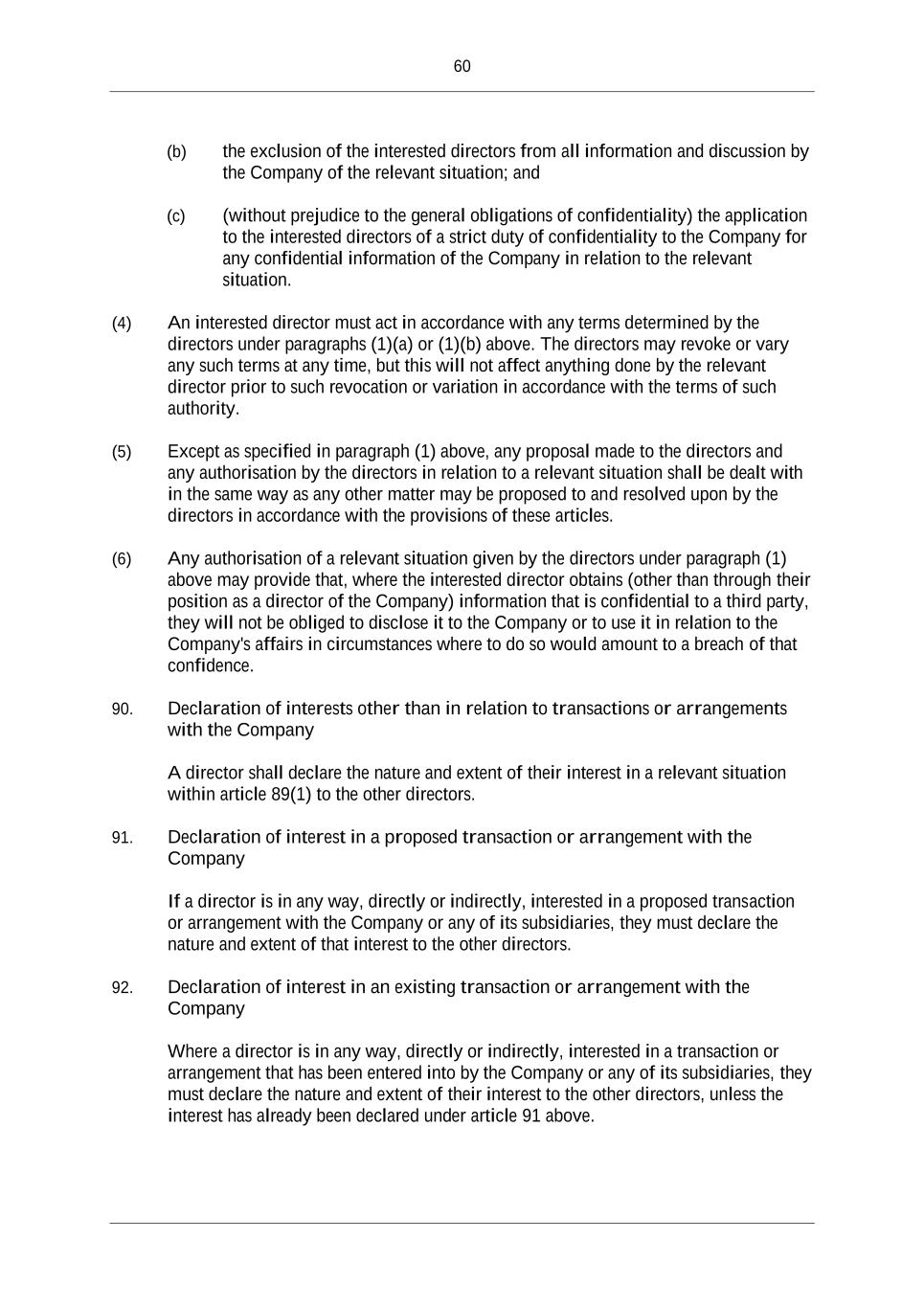 60 (b) the exclusion of the interested directors from all information and discussion by the Company of the relevant situation; and (c) (without prejudice to the general obligations of confidentiality) the application to the interested directors of a strict duty of confidentiality to the Company for any confidential information of the Company in relation to the relevant situation. (4) An interested director must act in accordance with any terms determined by the directors under paragraphs (1)(a) or (1)(b) above. The directors may revoke or vary any such terms at any time, but this will not affect anything done by the relevant director prior to such revocation or variation in accordance with the terms of such authority. (5) Except as specified in paragraph (1) above, any proposal made to the directors and any authorisation by the directors in relation to a relevant situation shall be dealt with in the same way as any other matter may be proposed to and resolved upon by the directors in accordance with the provisions of these articles. (6) Any authorisation of a relevant situation given by the directors under paragraph (1) above may provide that, where the interested director obtains (other than through their position as a director of the Company) information that is confidential to a third party, they will not be obliged to disclose it to the Company or to use it in relation to the Company's affairs in circumstances where to do so would amount to a breach of that confidence. 90. Declaration of interests other than in relation to transactions or arrangements with the Company A director shall declare the nature and extent of their interest in a relevant situation within article 89(1) to the other directors. 91. Declaration of interest in a proposed transaction or arrangement with the Company If a director is in any way, directly or indirectly, interested in a proposed transaction or arrangement with the Company or any of its subsidiaries, they must declare the nature and extent of that interest to the other directors. 92. Declaration of interest in an existing transaction or arrangement with the Company Where a director is in any way, directly or indirectly, interested in a transaction or arrangement that has been entered into by the Company or any of its subsidiaries, they must declare the nature and extent of their interest to the other directors, unless the interest has already been declared under article 91 above.